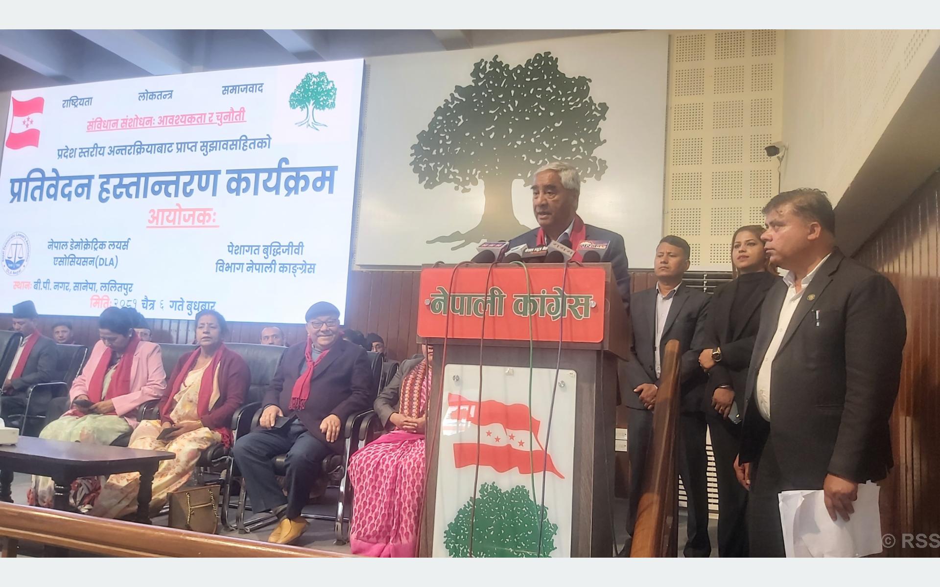 नेपाली कांग्रेस पेशागत तथा बुद्धिजीवी विभाग एवं नेपाल डेमोक्र्याटिक लयर्स एशोसियसनद्वारा पार्टीको केन्द्रीय कार्यालय सानेपामा आज आयोजित ‘संविधान संशोधनः आवश्यकता र चुनौती’ विषयमा देशका सातै प्रदेशमा आयोजित अन्तरक्रिया कार्यक्रमबाट प्राप्त सुझाव प्रतिवेदन हस्तान्तरण कार्यक्रममा मन्तव्य राख्दै सभापति देउवाले अहिलेको संविधानअनुसार कुनै पनि पार्टीको बहुमत आउन धेरै गाह्रो भए पनि महिलालाई प्रत्यक्ष राजकीय प्रशासनमा प्रत्यक्ष सहभागी हुने मौका प्राप्त भइरहेको बताए ।