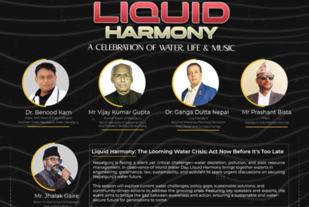 नेपालगन्ज । विश्व पानी दिवसका अवसरमा नेपालगन्जमा शनिवार सुक्दै गएको भुमिगत जलस्रोतको अवस्था र दीर्घकालीन समाधानका बिषयमा विषय बिज्ञ र सरोकारवालाबीच पानी बहस हुने भएको छ । ‘लिक्विड हार्मोनी’ शीर्षकमा आसन्न पानीको संकट र व्यवस्थापनका उपाय बिषयमा प्यानल छलफल हुने भएको हो ।