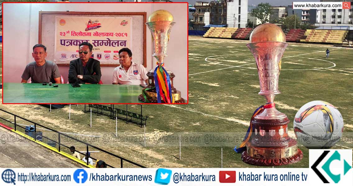 बुटवल । रुपन्देहीकै पुरानो र प्रतिष्ठित तिलोत्तमा गोल्डकप फुटबल प्रतियोगिता भोली शनिबारदेखी शुरु हुदैछ । देविनगरस्थित एन्फा टेक्निकल खेलमैदान प्रतियोगिता आयोजना हुने प्रतियोगिताको २३ औं संस्करणको सबै तयारी पूरा भएको आज पत्रकार सम्मेलन गरि रुपन्देही जिल्ला फुटबल संघका अध्यक्ष लोक पुनले जानकारी दिए । प्राविधिक पक्षमा धेरै काम भएको उनले बताए ।