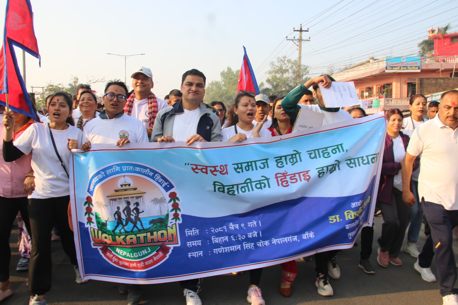 नेपालगन्ज । स्वास्थ्यका लागि प्रातकालिन हिडाई भन्ने मूल नाराका साथ शनिबार बिहान नेपालगन्जमा वाकाथनको आयोजना गरिएको छ । बरिष्ठ बालरोग विशेषज्ञ डा. किशोर खत्रीको संयोजनमा र चिकित्सक संघ बाँकेको आयोजनामा भएको वाकाथनको बिहान साढे ७ बजे स्वास्थ्य तथा जनसंख्यामन्त्री प्रदीप पौडेलले उद्घाटन गरे ।