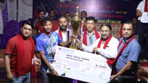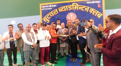 बुटवल । बुटवल ब्याडमिन्टन क्लबद्वारा आयोजित “तेस्रो राष्ट्रिय ब्याडमिन्टन प्रतियोगितामा मेन्स सिंगल र मेन्स डबल को उपाधी ए.पी.एफ को पोल्टामा रहेको छ । मेन्स सिंगल तर्फ राष्ट्रिय रेङ्किङ खेलाडी प्रिन्स दाहालले ए.पि.एफ. कै क्षितिज खनाल लाई हराउदै उपाधी चुनेका हुन ।