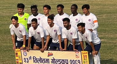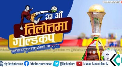 बुटवल । २३ औ तिलोत्तमा गोल्ड कप नकआउट फुटबल प्रतियोगितामा शनिबारदेखी शुरु भएको छ । बुटवल उपमहानगरपालिकाको संरक्षक, यशोदा फुड्स प्रालि र त्रिमुर्ति ईण्डस्ट्रिज प्रालिको मुख्य प्रायोजक तथा प्रदेश खेलकुद परिषद लुम्बिनी मुख्य सहयोगमा शुरु भएको उद्घाटन खेलको पहिलो हाफमा सशस्त्र प्रहरी बल एपीएफ क्लबले आयोजक रुपन्देही ११ माथि १–० गोलको अग्रता लिएको छ । निक्कै प्रतिस्प्रर्धात्मक खेलको १७ औ मिनेटमा एपीएफका हरि कार्कीले गोल गर्दै टिमलाई अग्रता दिलाए । दोस्रो हाफ शुरु भएसंगै हावाहुरीका चलेपछि खेल रोकियो । लामोसमय मौसम प्रतिकुल भएपछि खेल स्थगित गर्ने निर्णय भएको संघका अध्यक्ष लोक पुनले बताए । रोकीएको बाँकी खेल भोलि बिहान ८ बजे हुने उनले बताए ।