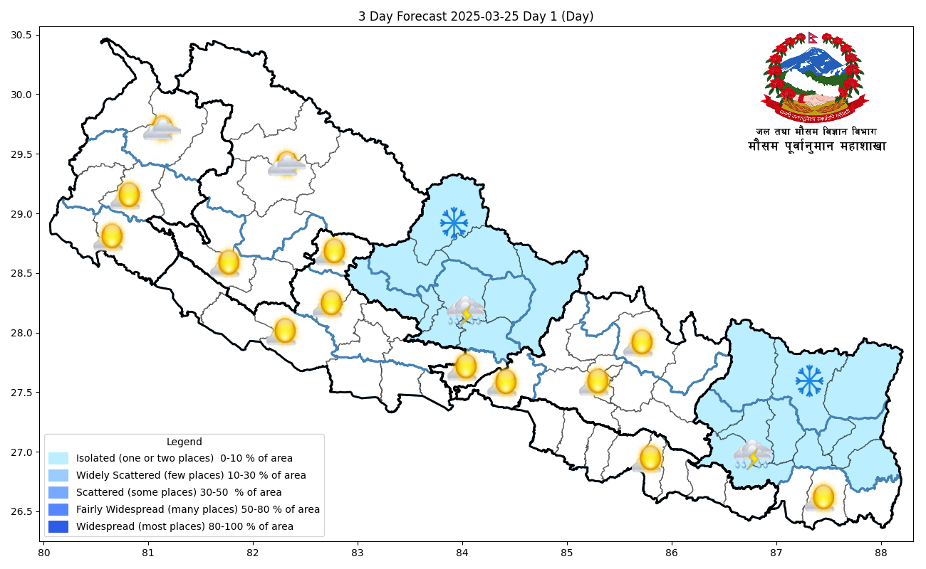 आगामी २४ घण्टामा कोशी र गण्डकी प्रदेशका पहाडी भागको एक-दुई स्थानमा मेघगर्जन र चट्याङसहित हल्का वर्षाका साथै उच्च पहाडी तथा हिमाली भागका एक-दुई स्थानमा हल्का हिमपातको सम्भावना रहेको जनाउँदै महाशाखाले दैनिक जनजीवन, कृषि, स्वास्थ्य, सडक तथा हवाईउड्डयनमा आंशिक प्रभाव पर्न सक्ने हुँदा त्यसबाट हुनसक्ने असरबाट बच्न सतर्कता अपनाउन विभागले अनुरोध गरेको छ ।