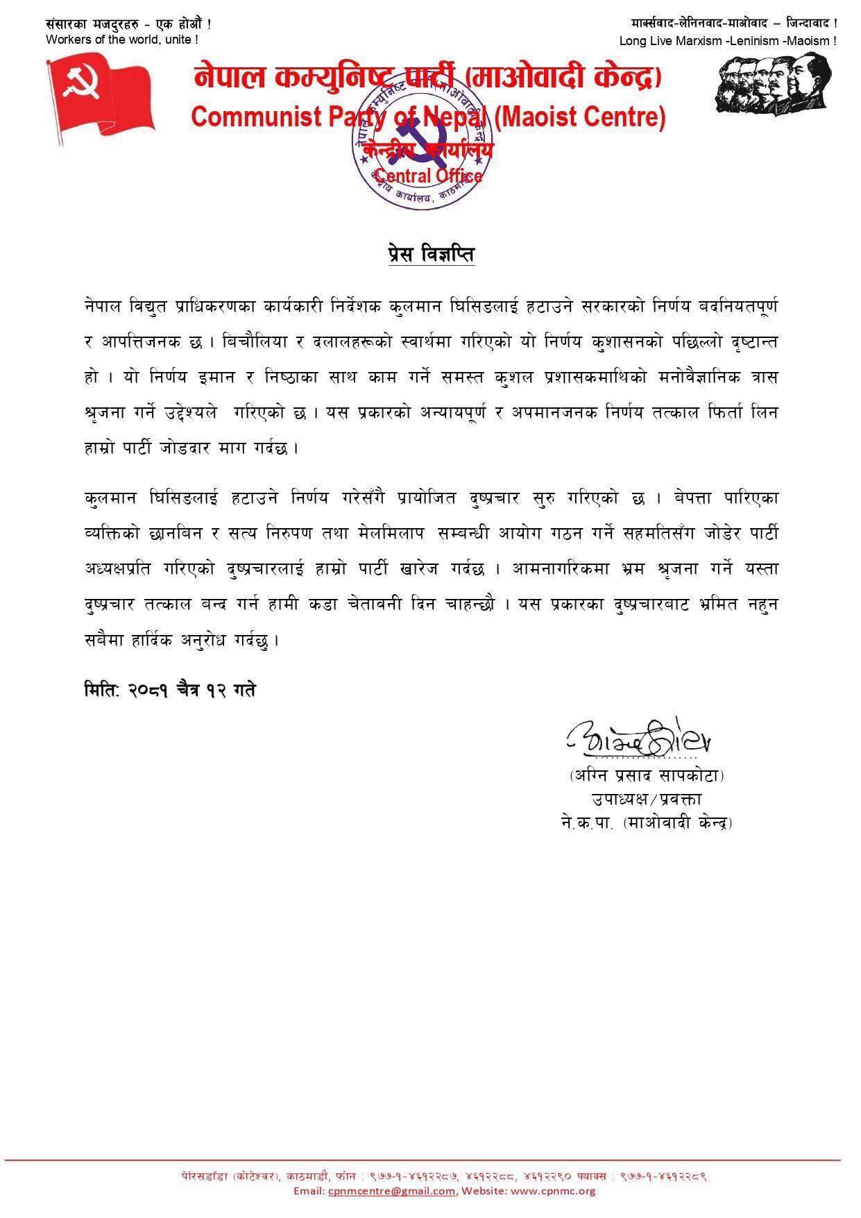 काठमाडौं । नेपाल कम्युनिष्ट पार्टी (माओवादी केन्द्र)ले नेपाल विद्युत् प्राधिकरणका कार्यकारी निर्देशकबाट कुलमान घिसिङलाई हटाउने सरकारको निर्णयको विरोध गरेको छ ।