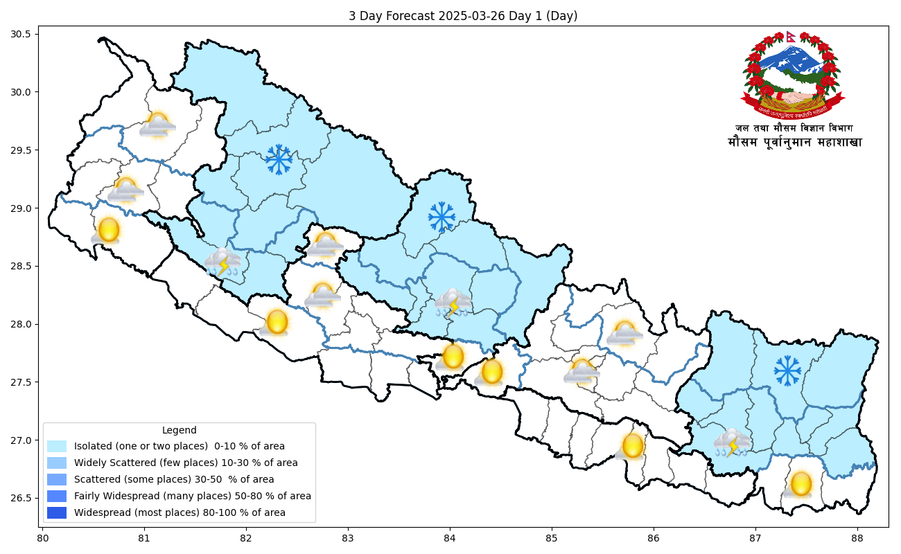 आगामी २४ घण्टामा कोशी, गण्डकी र कर्णाली प्रदेशका पहाडी भागका एक-दुई स्थानमा मेघगर्जन र चट्याङसहित हल्का वर्षाका साथै उच्च पहाडी तथा हिमाली भागका एक-दुई स्थानमा हल्का हिमपातको सम्भावना रहेको जनाउँदै महाशाखाले त्यसबाट दैनिक जनजीवन, कृषि, स्वास्थ्य, सडक तथा हवाईउड्डयनमा आंशिक प्रभाव पर्न सक्ने हुँदा सतर्कता अपनाउन विभागले सम्बद्ध सबैमा अनुरोध गरेको छ ।