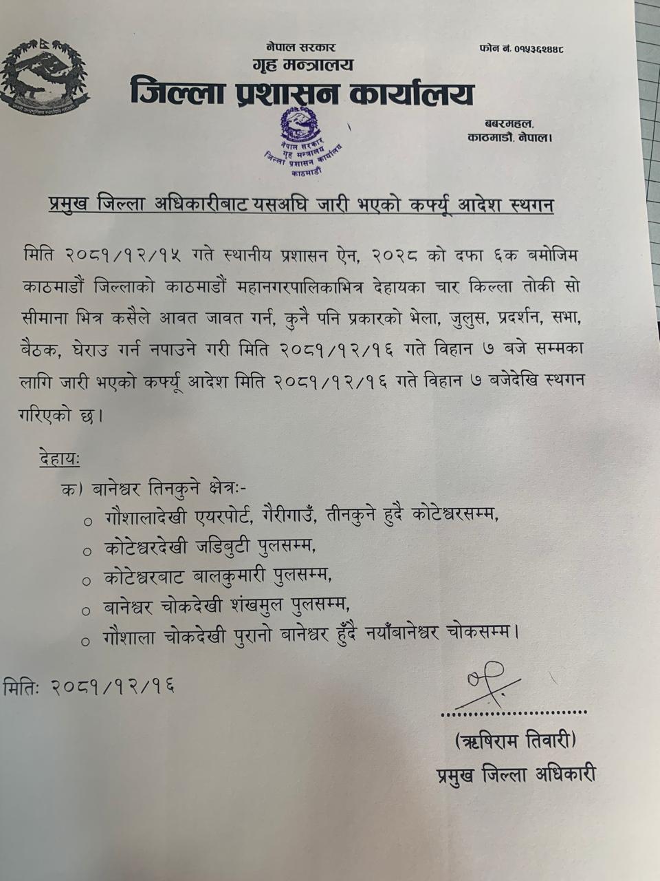 जिल्ला प्रशासन कार्यालय काठमाडौंले बिहान ७ बजेबाट कर्फ्यु हटेको बताएको छ । जिल्ला प्रशासन कार्यालय काठमाडौंका प्रमुख जिल्ला अधिकारी ऋषिराम तिवारीले अहिलेलाई काठमाडौंमा लगाइएको कर्फ्यु हटाइएको जानकारी दिए ।