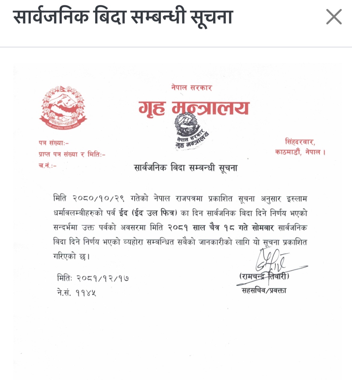 मुस्लिम समुदायको मुख्य पर्व इद उल फितरको अवसरमा सरकारले सोमबारका लागि सार्वजनिक बिदा दिने निर्णय गरेको छ । २०८० माघ २९ गते राजपत्रमा प्रकाशित सूचनाका आधारमा इस्लाम धर्मालम्बिहरुको पर्वका दिन सार्वजनिक बिदा दिने निर्णय भएको संघीय सरकारको गृहमन्त्रालयको सूचनामा उल्लेख छ ।