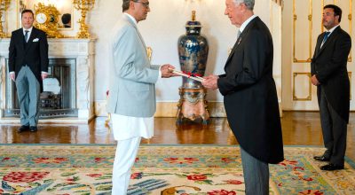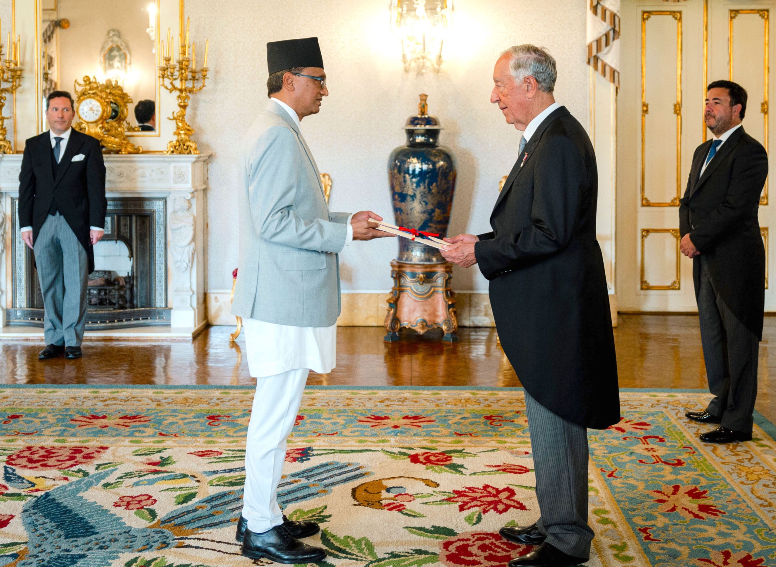 लिस्बन । पोर्चुगलका लागि नवनियुक्त नेपाली राजदूत प्रकाशमणि पौडेलले राष्ट्रपति मार्सेलो रेबेलो डी सौसासमक्ष ओहोदाको प्रमाणपत्र पेस गरेका छन ।