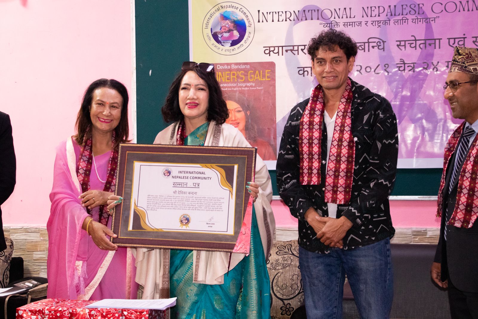 काठमाडौं । इन्टरनेशनल नेप्लिज कम्युनिटी काठमाडौंको आयोजनामा क्यान्सर रोगसम्बन्धी सचेतना कार्यक्रम, वरिष्ठ गायिका देविका बन्दनाको क्यान्सर रोगमाथि विजय प्राप्त गरिसकेपछिको अनुभव तथा सम्मान समारोह अर्याल इन्टरनेशनल होटल, बानेश्वरमा सम्पन्न भएको छ ।