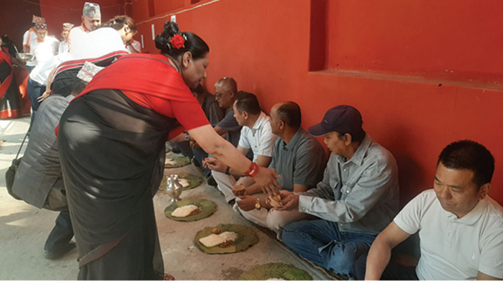 नेवाः भोजमा सहभागीलाई सुकुलमा पलेँटी कसेर खाना खान राखिएको थियो । सुकुलको सबैभन्दा माथि ज्येष्ठ नागरिकलाई राखिएको थियो । भोज सालको पात (लप्ते) मा खुवाइएको हो । लप्तेमा भोजको प्रारम्भिक परिकारहरू राखिसकेपछि सबैभन्दा पहिले ज्येष्ठ नागरिकले खान सुरु गरेपछि अरूले खान सुरु गरेका भन्दै यो नेवारी परम्परा रहेको उनले जानकारी दिए । भोजमा तीन चरणसम्म दोहोरिँदै परिकार राख्न ल्याइएको थियो ।