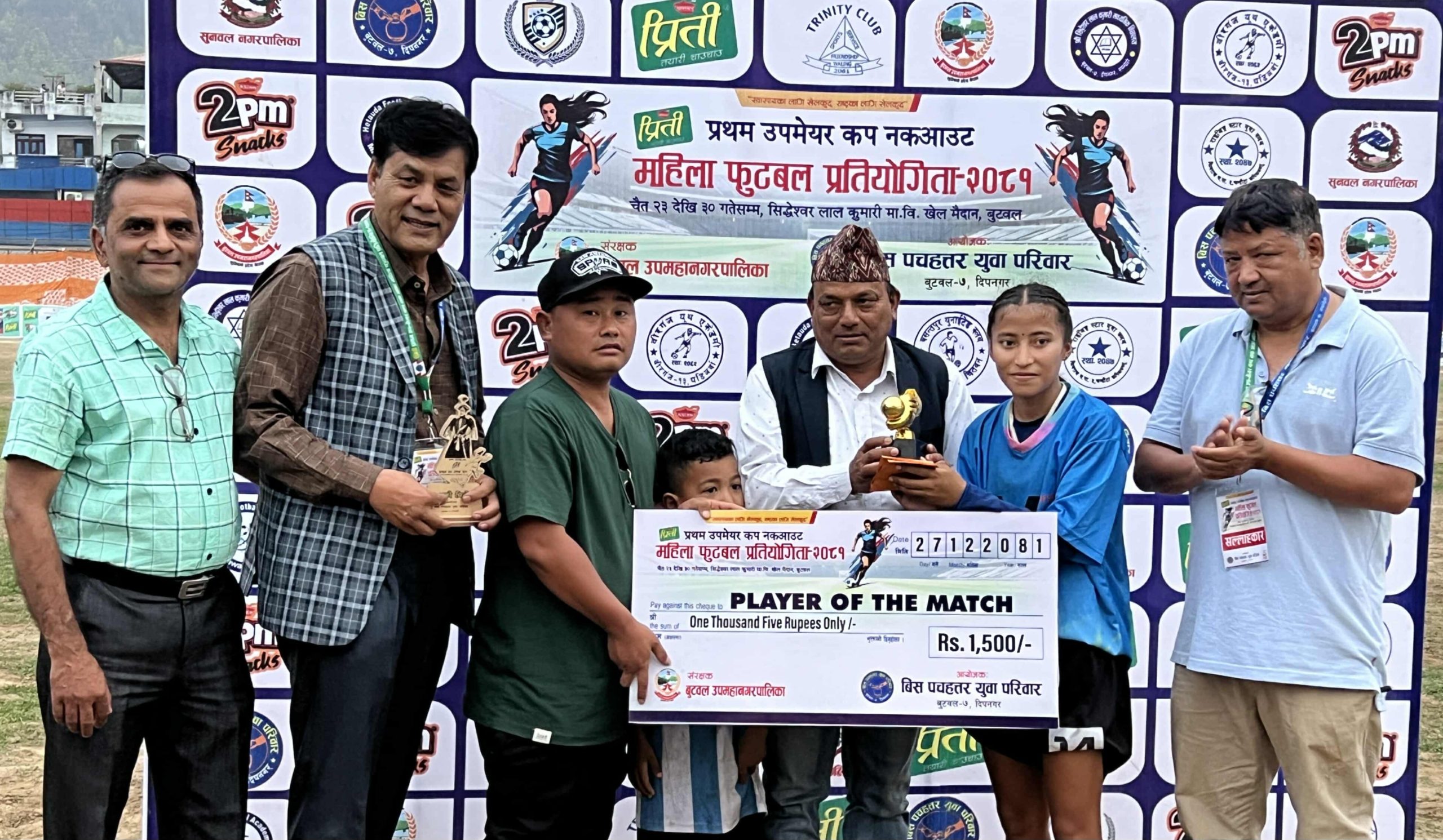 खेलमा उत्कृष्ट खेल प्रदर्शन गरेकी राईजिङकी भुमिका बुढाथोकी प्लेयर अफ दी म्याचबाट पुरस्कृत भएको संयोजक बुद्घि बहादुर दर्जीले बताए ।