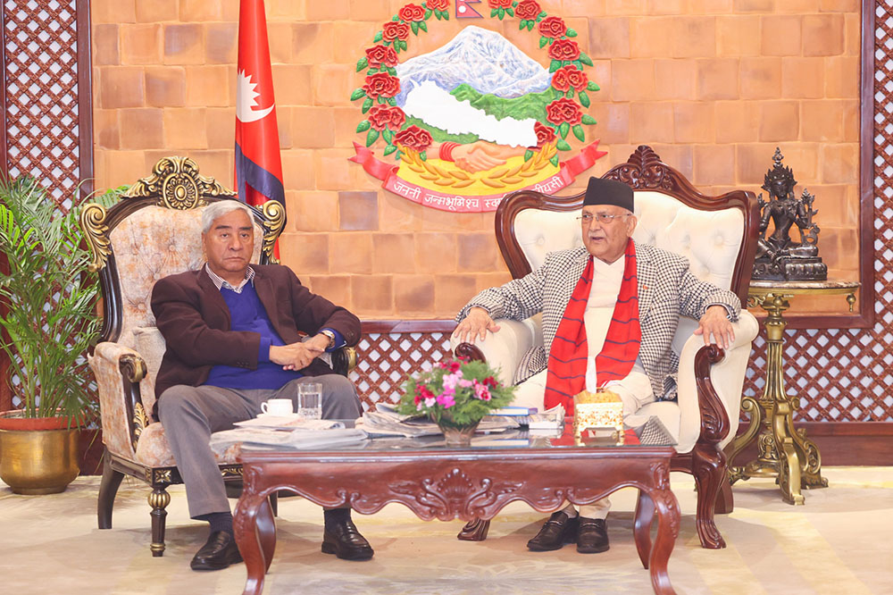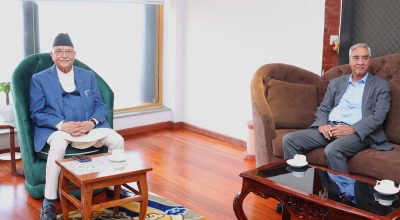 काठमाडौं। प्रधानमन्त्री केपी शर्मा ओली र नेपाली कांग्रेसका सभापति शेरबहादुर देउवाबीच भेटवार्ता भएको छ ।
