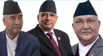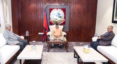 काठमाडौं । प्रधानमन्त्री केपी शर्मा ओलीसहित प्रमुख तीन राजनीतिक दलका शीर्ष नेताहरूबीच विद्यमान राजनीतिक व्यवस्था र सङ्घीय लोकतान्त्रिक गणतन्त्र नेपालको संविधान रक्षाका लागि उपयुक्त वातावरण बनाउँदै अघि बढ्ने विषयमा आज छलफल भएको छ ।