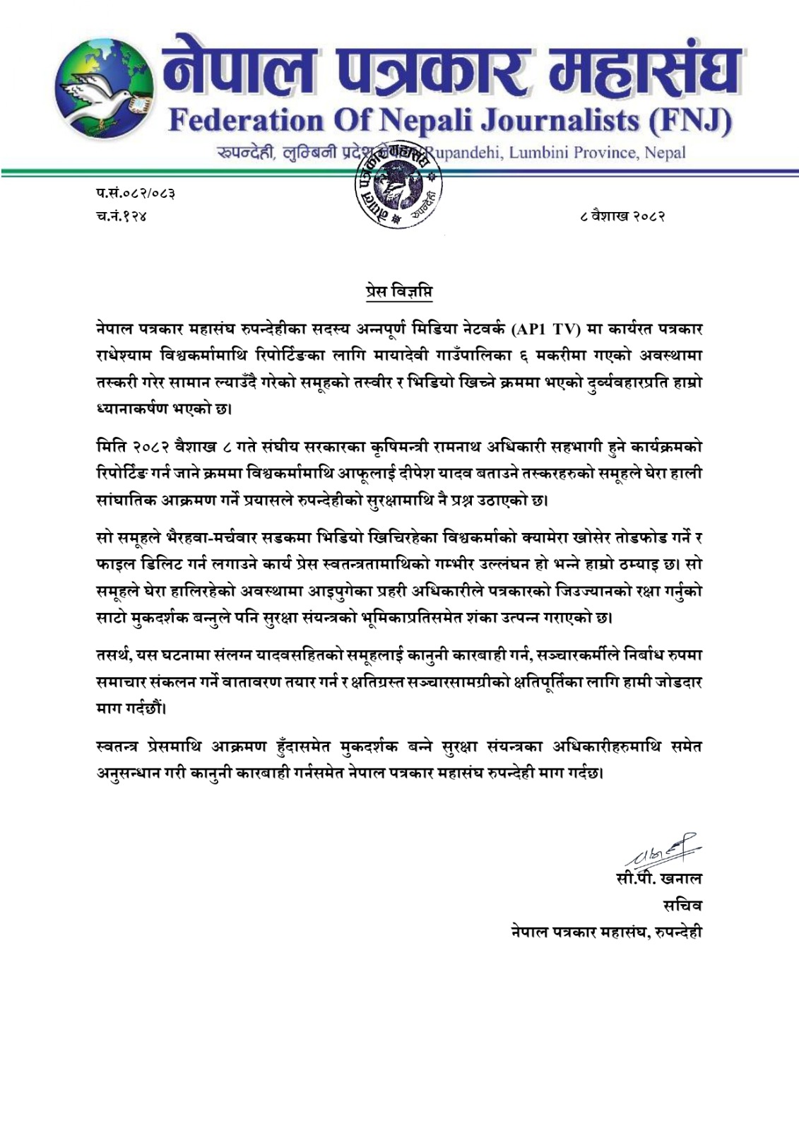 ‘मिति २०८२ वैशाख ८ गते संघीय सरकारका कृषिमन्त्री रामनाथ अधिकारी सहभागी हुने कार्यक्रमको रिपोर्टिङ गर्न जाने क्रममा विश्वकर्मामाथि आफूलाई दीपेश यादव बताउने तस्करहरुको समूहले घेरा हाली सांघातिक आक्रमण गर्ने प्रयासले रुपन्देहीको सुरक्षामाथि नै प्रश्न उठाएको छ’, महासंघले जारी गरेको विज्ञप्तीमा भनिएको छ, ‘सो समूहले भैरहवा-मर्चवार सडकमा भिडियो खिचिरहेका विश्वकर्माको क्यामेरा खोसेर तोडफोड गर्ने र फाइल डिलिट गर्न लगाउने कार्य प्रेस स्वतन्त्रतामाथिको गम्भीर उल्लंघन हो भन्ने हाम्रो ठम्याइ छ । सो समूहले घेरा हालिरहेको अवस्थामा आइपुगेका प्रहरी अधिकारीले पत्रकारको जिउज्यानको रक्षा गर्नुको साटो मुकदर्शक बन्नुले पनि सुरक्षा संयन्त्रको भूमिकाप्रतिसमेत शंका उत्पन्न गराएको छ ।’