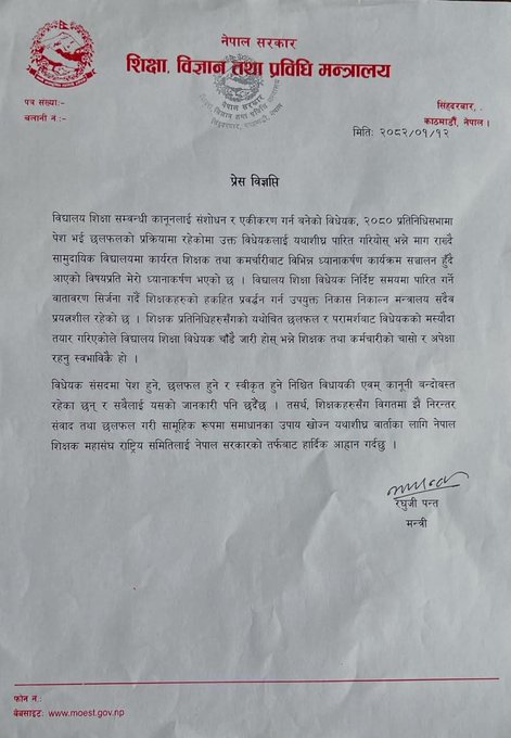 विद्यालय शिक्षा ऐन जारी हुनुपर्ने मागसहित आन्दोलन गर्दै आएका शिक्षकहरूको आन्दोलनप्रति ध्यानाकषर्ण भएको जनाउँदै उनले शिक्षकहरुसँग विगतमा झैँ निरन्तर संवाद तथा छलफल गरी सामूहिक रूपमा समाधानका उपाय खोज्न यथाशीघ्र वार्ता आउन अनुरोध गरेका छन ।