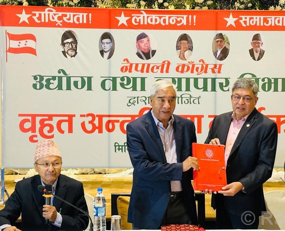 आगामी आर्थिक वर्षको बजेट निर्माणका सन्दर्भमा नेपाली कांग्रेसको उद्योग तथा व्यापार विभागले आज यहाँ आयोजना गरेको कार्यक्रममा चेम्बरले औद्योगिक एवं व्यापारिक क्षेत्रमा देखिएका समस्या एवं सुधारको पहलसहित विभिन्न सुझाव दिएको हो । चेम्बर अफ कमर्सका कार्यवाहक अध्यक्ष दीपककुमार मल्होत्राले कांग्रेस सभापति शेरबहादुर देउवालाई सुझाव हस्तान्तरण गरे ।