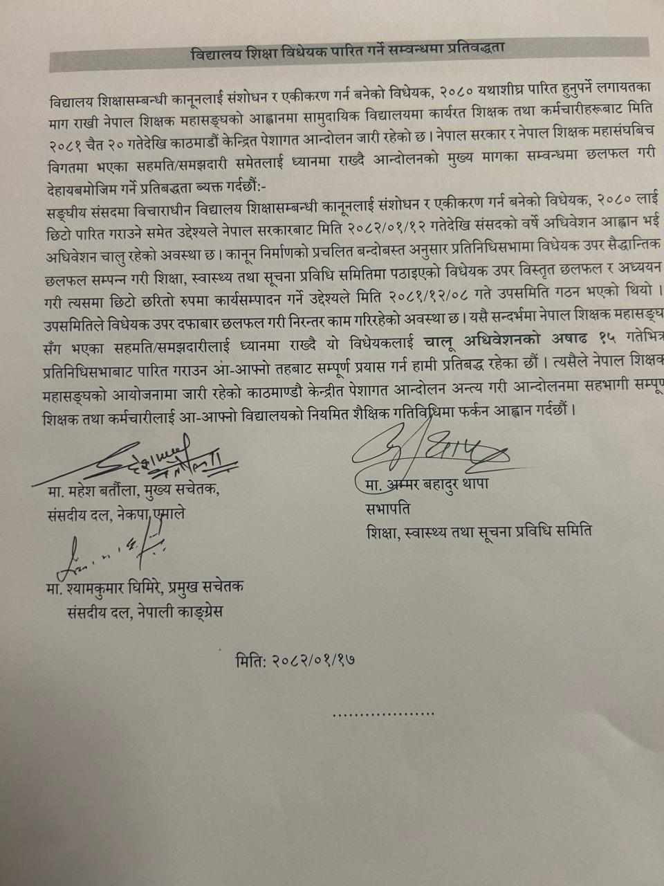 विद्यालय शिक्षा विधेयक असार १५ गतेभित्र पारित गर्ने विषयमा पनि मन्त्रालय र शिक्षक महासंघबीच सहमति भएको छ । बिषयगत समितिका सभापति र कांग्रेस र एमालेका सचेतकहरुलाई साछी राखेर ऐन बनाएर असार १५ गते बिधेयक पारित गर्ने लिखित सहमति भएको गृहमन्त्री रमेश लेखकले जानकारी दिए । उनले सभापति सहित सचेतकहरुले लिखित सहमति कायम गरेकाले तोकिएको समयमा बिधेयक पारित हुने विश्वास दिलाए ।