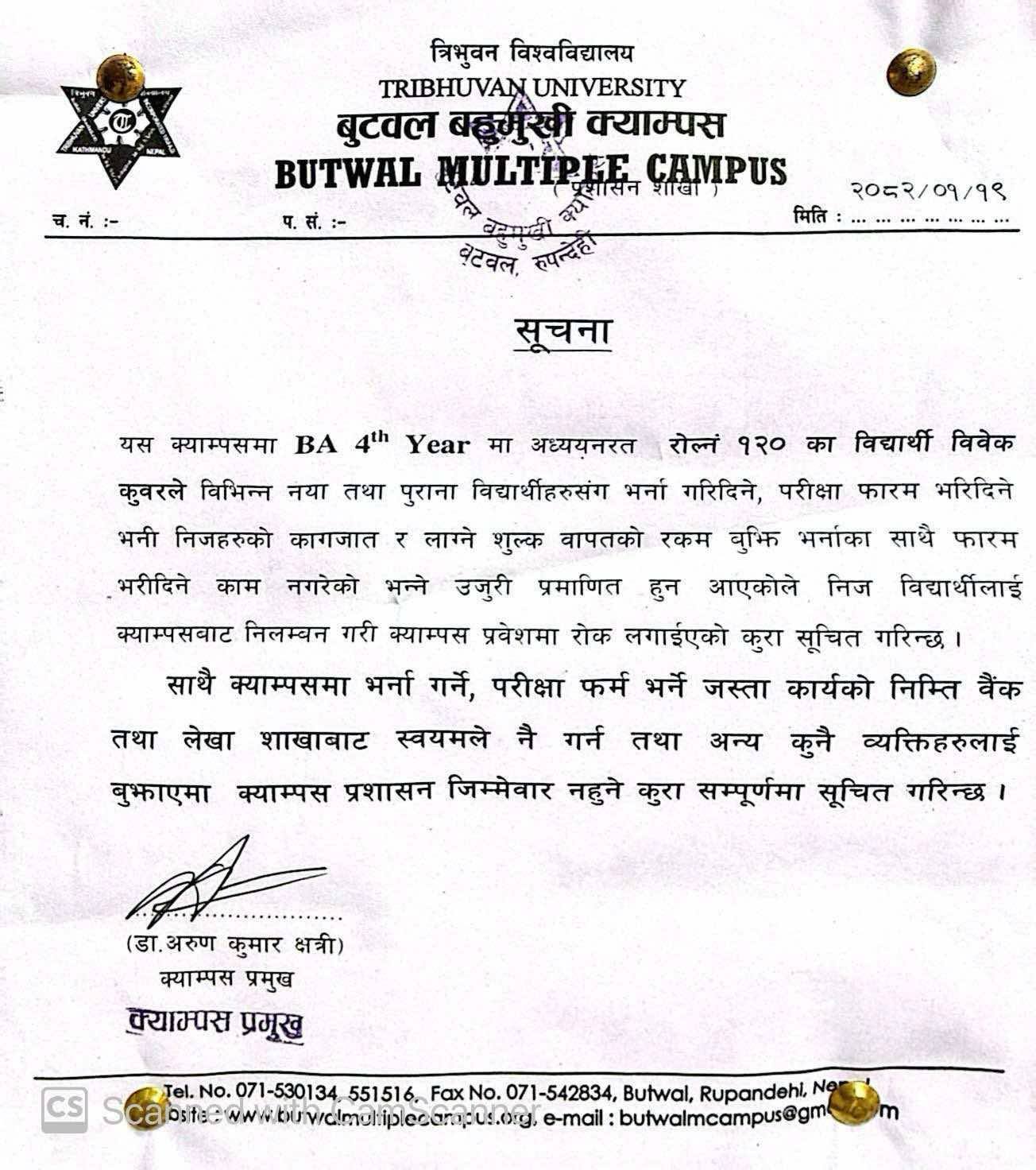 क्याम्पस प्रमुख डा. अरुण कुमार क्षत्रीले बैशाख १९ गते जारी गरेको सूचनामा भनिएको छ, “उजुरी प्रमाणित भएकाले निज विद्यार्थीलाई क्याम्पसबाट निलम्बन गरी क्याम्पस प्रवेशमा समेत रोक लगाइएको छ ।” साथै सूचनामा क्याम्पसका सबै विद्यार्थीलाई भर्ना तथा परीक्षा फारमसम्बन्धी काम आफूले नै बैंक तथा लेखा शाखाबाट गराउन पनि आग्रह गरिएको छ । अन्य व्यक्तिमार्फत कार्य गराएमा त्यसको जिम्मेवारी क्याम्पस प्रशासनले नलिने समेत उनले स्पष्ट पारेका छन् ।