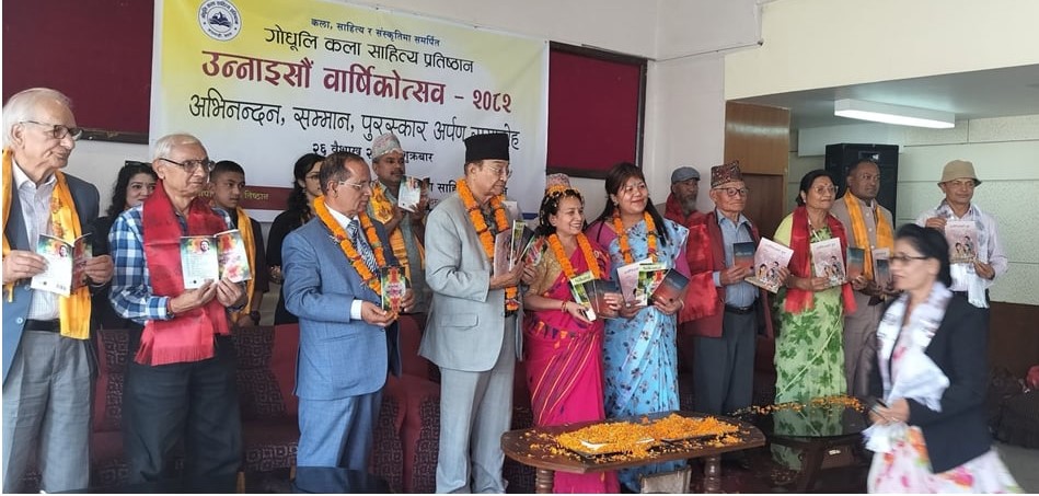 काठमाडौं । गोधूलि कला साहित्य प्रतिष्ठानले आफ्नो वार्षिकोत्सवको अवसरमा यहाँँ साहित्यकारहरुलाई अभिनन्दन, सम्मान तथा पुरस्कार वितरण कार्याक्रमको आयोजना गरेको छ ।