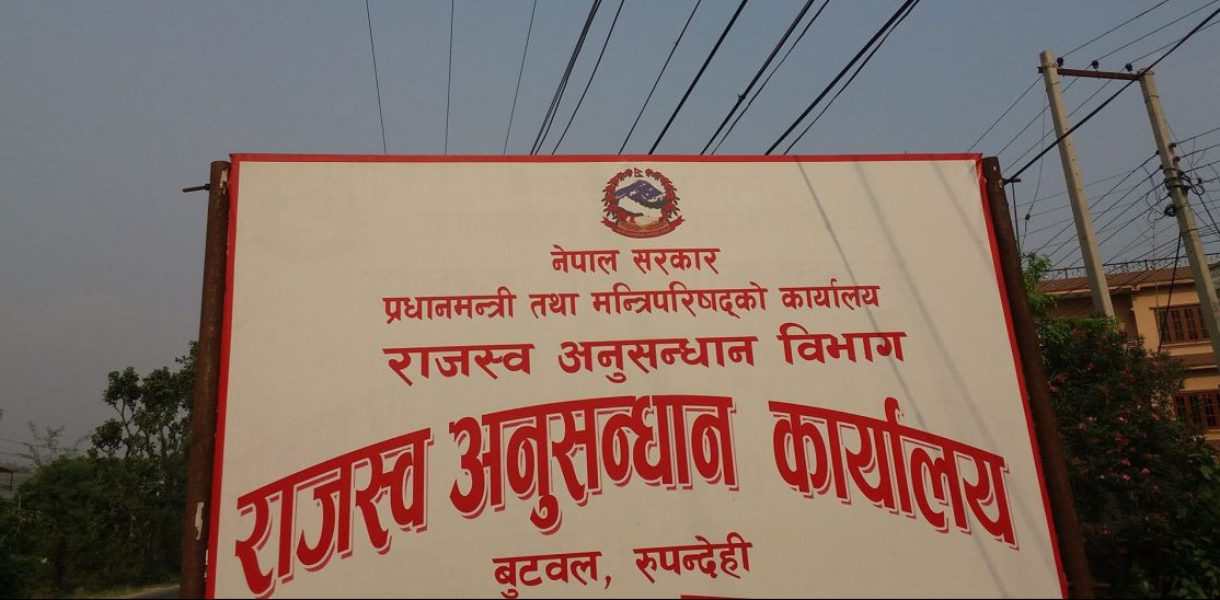 राजस्व अनुसन्धान कार्यालय, बुटवलको अनुसन्धान तथा तहकीकातबाट रुपन्देहीको तिलोत्तमा नगरपालिका–४, शुभलक्ष्मी पथका जगनन्नाथ खनाल र तिलोत्तमा नगरपालिका–४ नयाँमिलका दधिराम खरेललविरुद्ध राजस्व अनुसन्धान कार्यालय बुटवलले राजस्व चुहावट गरेको अभियोगमा उच्च अदालत तुलसीपुर, बुटवल इजलासमा मुद्दा दायर गरेको कार्यालय प्रमुख, प्रमुख राजस्व अधिकृत विवेक घिमिरेले जानकारी दिए ।