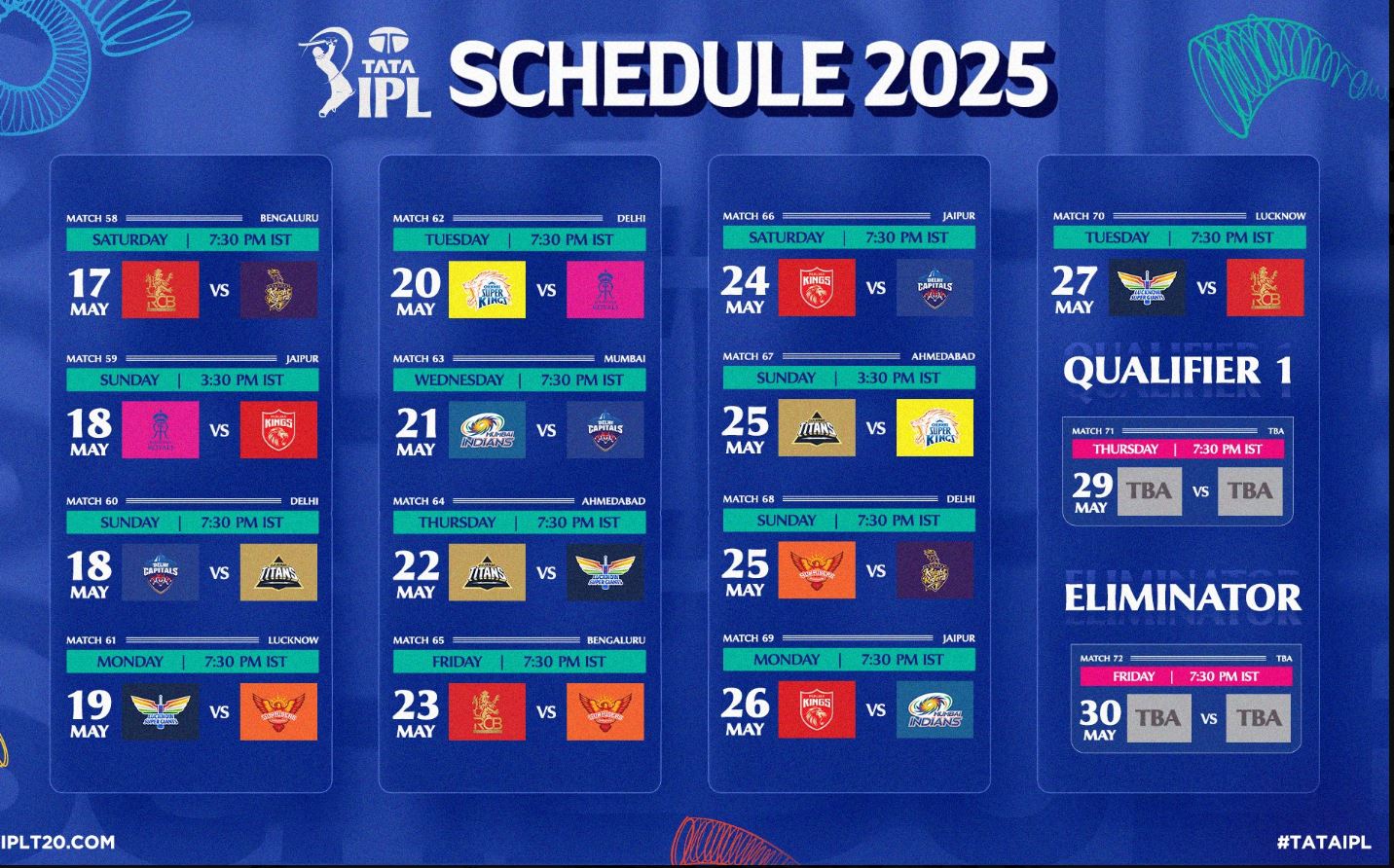 भारत र पाकिस्तानका बिचमा तनाव ब्यवस्थापन भइ युद्द बिराम भए पछि पुन आइपीएल खेल सुरू हुन लागेको हो । पञ्जाब र दिल्ली बिच जारी भइरहेको खेल स्थगित गरे पछि अन्यौल छाएको थियो । आजको पहिलो खेल अर्थात ५८ म्याच  बैंग्लरू र कलकताका बिचमा साँझ ७ः३० बजेबाट सुरू हुनेछ ।