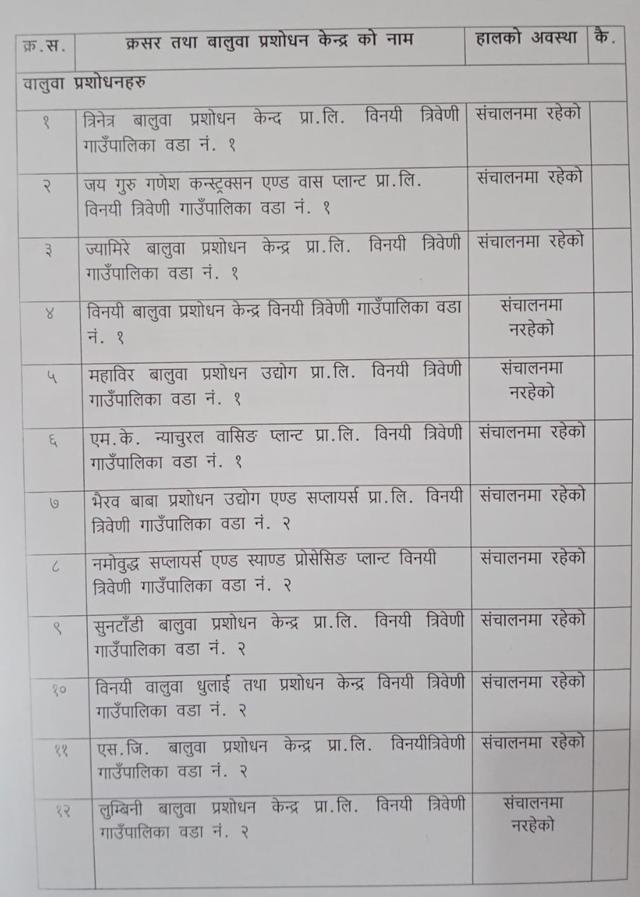 बिनयी त्रिबेणी गाउँपालिका अध्यक्ष घनश्याम गिरीले हाल गाउँपालिकामा १९ वटा बालुवा प्रशोधन उद्योग सञ्चालित भएको बताए । “गाउँपालिकाको अभिलेखअनुसार सबैभन्दा बढी बालुवा प्रशोधन उद्योग यहीँ छन्,” अध्यक्ष गिरीले भने, “यिनीहरूले वातावरणीय मूल्यांकन अनिवार्य रूपमा दुई/दुई वर्षमा गर्नु पर्ने कानुनी प्रावधान छ।”