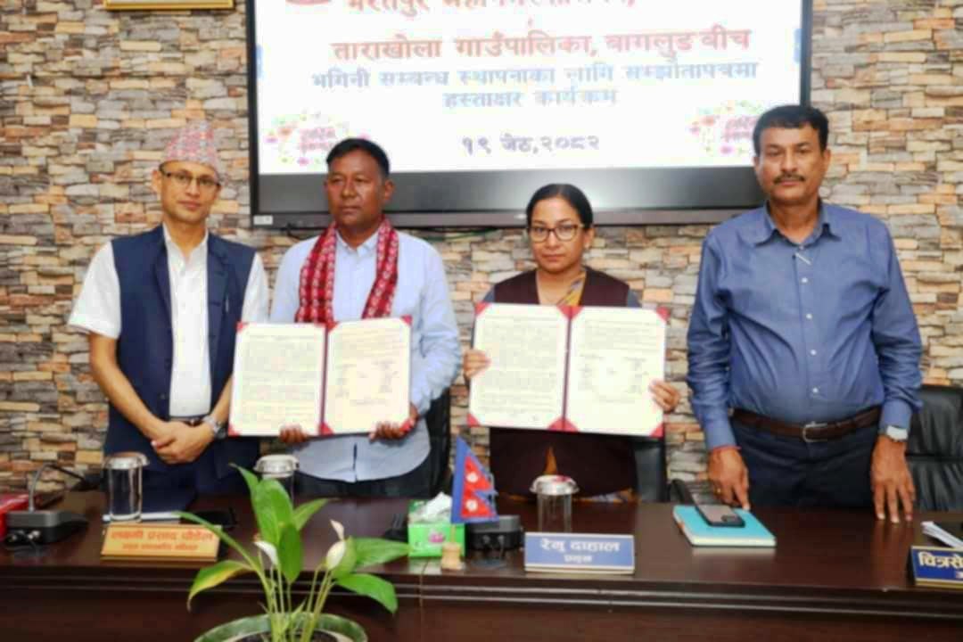 बागलुङ । बागलुङको ताराखोला गाउँपालिका र चितवनको भरतपुर महानगरपालिकाबीच भगिनी सम्बन्ध कायम गरिएको छ । असल अभ्यास आदानप्रदान तथा कृषि, पर्यटन, शिक्षालगायत क्षेत्रमा सहकार्य गर्नका लागि दुई स्थानीय तहले भगिनी सम्बन्ध कायम गरेका हुन् ।