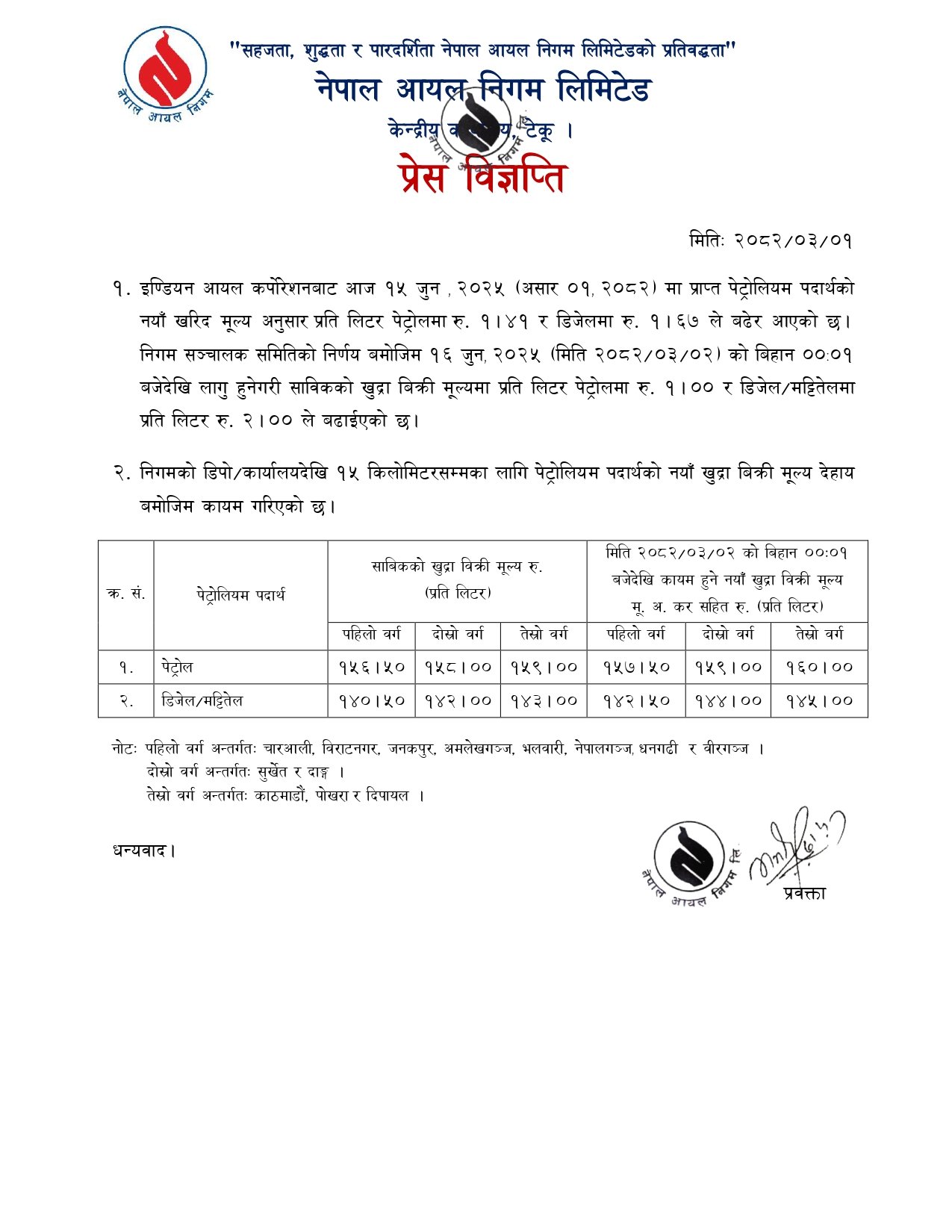 इण्डियन आयल कर्पोरेशनबाट आज १५ जुन २०२५ (असार ०१ २०८२) मा प्राप्त पेट्रोलियम पदार्थको नयाँ खरिद मूल्य अनुसार प्रति लिटर पेट्रोलमा रु. १.४१ र डिजेलमा रु. १.६७ ले बढेर आएको निगमले जनाएकाे छ।