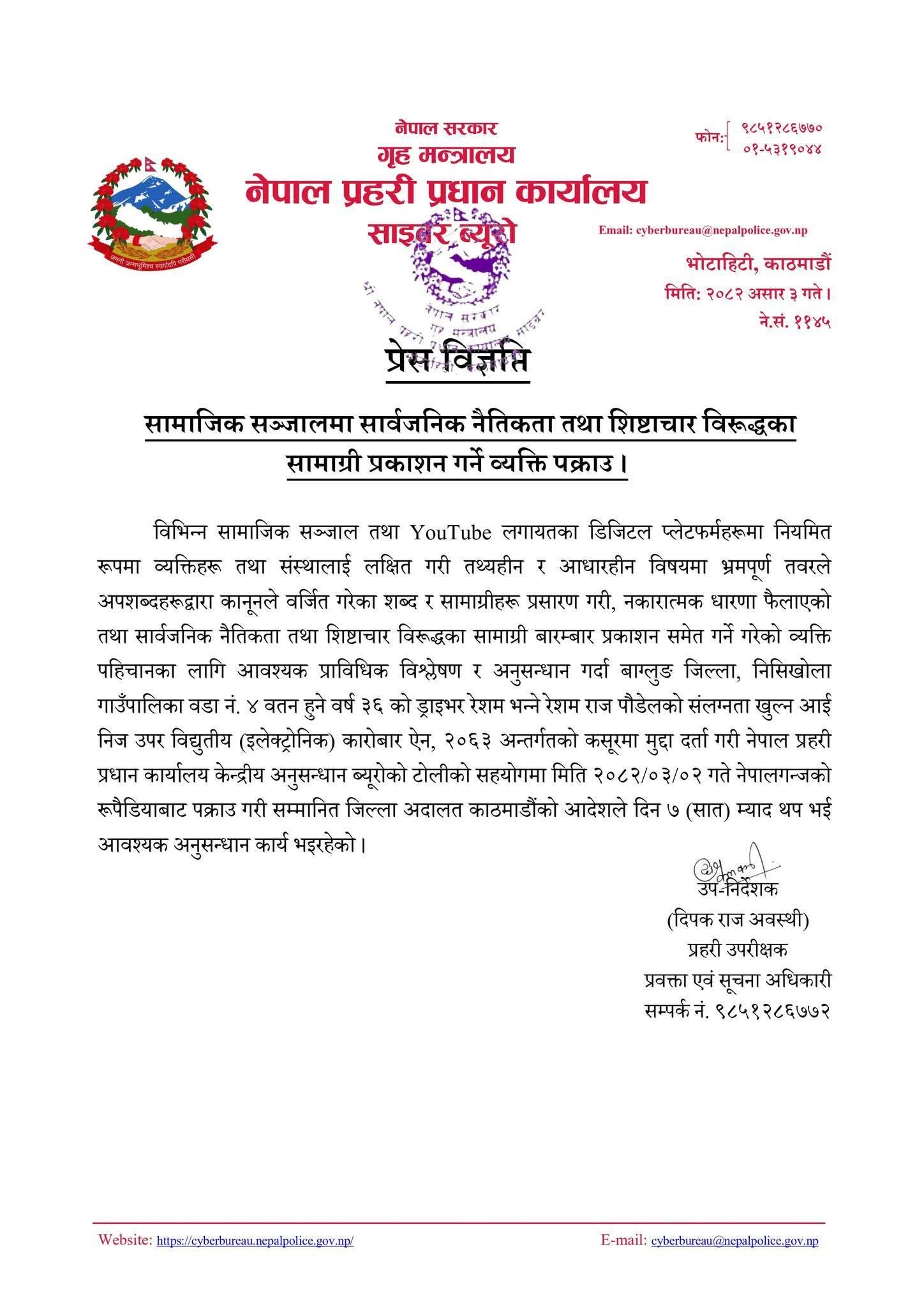 प्रहरीको साइबर ब्यूरोले प्रकाशित गरेको विज्ञप्तिमा युट्युब लगायतका डिजिटल प्लेटफर्महरूमा नियमित रूपमा व्यक्तिहरू तथा संस्थालाई लक्षित गरी तथ्यहीन र आधारहीन विषयमा सामाग्रीहरू प्रसारण गरी नकारात्मक धारणा फैलाएको तथा सार्वजनिक नैतिकता तथा शिष्टाचार विरूद्धका सामाग्री बारम्बार प्रकाशन समेत गर्ने गरेको घटनाको अनुसन्धानको क्रममा साइबर ब्यूरोबाट खटिएको प्रहरीले केन्द्रीय अनुसन्धान ब्यूरोको सहयोगमा उक्त कार्यमा संलग्न उनलाई नेपालगंज रूपैडियाबाट पक्राउ गरेको उल्लेख छ ।