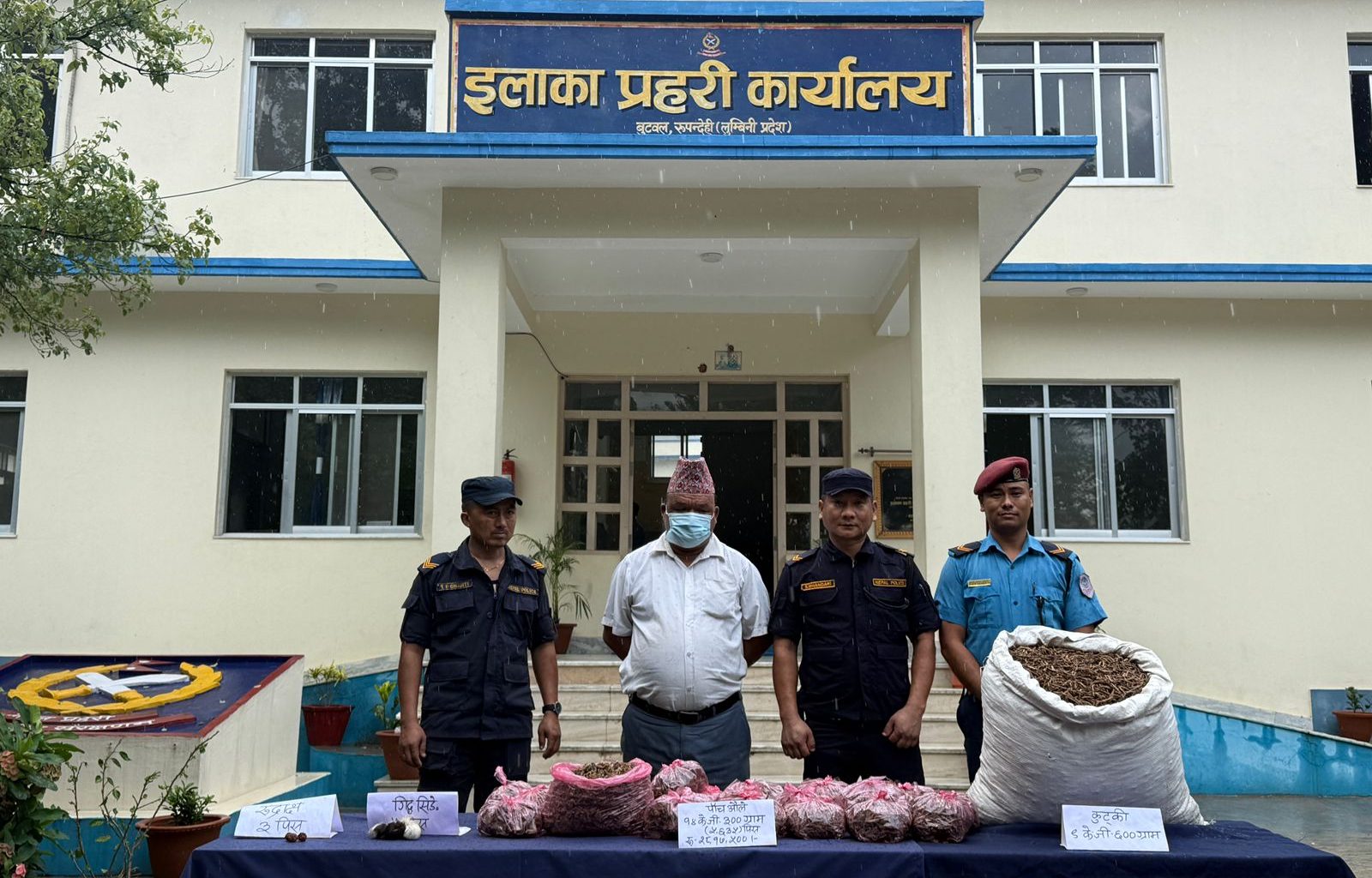 पक्राउ पर्नेमा बुटवल २ आँखा अस्पताल भिमसेन टोलका अहमद्दिन अलीको घरमा घरभाडामा बस्ने जुम्ला कन्कासुन्दरी गाउँपालिका वडा नं. ४ बस्ने बर्ष ४८ को सुक बहादुर वुढा रहेका छन् । बुढाका साथबाट सेतो बोरामा र सेतो प्लाष्टिकको बाल्टीमा राखेको पाँच औले जस्तो देखिने जडिबुटी (तौल गर्दा १६ के.जी.१०० ग्राम ५ हजार ,६३५ पिस) अन्दाजी मूल्य मुल्य रु.२८ लाख १७ हजार ५००, सेतो बोरामा राखिएको कुट्की जस्तो देखिने पदार्थ ९ के.जी. ६०० ग्राम, सेतो प्लाष्टिकमा राखेको गिद्ध सिङे ५ थान र रुद्राक्ष ३ थान बरामद भएको इलाका प्रहरी कार्यालय बुटवलले जनाएको छ ।