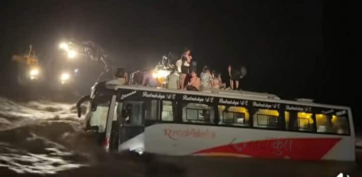 विनयीखोलाको बाढीले यात्रुबाहक बस बगायो, ३८ यात्रुको सकुशल उद्धार