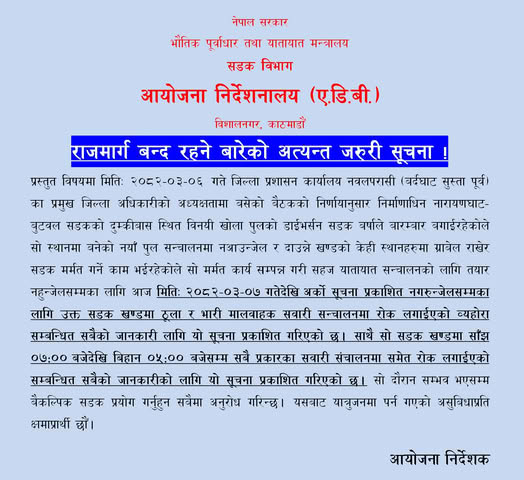 बुटवल नारायणगढ खण्डमा दिउँसोको समयमा ठुला र मझौला सम्पूर्ण सवारी साधन संचालनमा रोक लगाइएको छ भने रातीको समयमा कुनैपनि सवारी साधन संचालन गर्न रोक लगाइएको छ । ‘जिल्ला प्रशासन कार्यालय नवलपरासी (बर्दघाट सुस्ता पूर्व) का प्रमुख जिल्ला अधिकारीको अध्यक्षतामा यसेको वैठकको निर्णायानुनार निर्माणाधिन नारायणघाट बुटवल सडकको दुम्कीवास स्थित विनयी खोला पुलको डाईभर्सन सड़क वपत्ति वारम्बार वगाईरहेकोल सो स्थानमा बनेको नयाँ पुल सन्चालनमा नआउन्जेल र दाउन्ने खण्डको केही स्थानहरुमा ग्रावेल राखेर सडक मर्मत गर्ने काम भईरहेकोले सो मर्मत कार्य सम्पन्न गरी सहज यातायात सन्चालनको लागि तयार नहुन्जेलसम्मका लागि आज मितिः २०८२/०३/०७ गतेदेखि अकों सूचना प्रकाशित नगरुन्जेलसम्मका लागि उक्त सड़क खण्डमा ठूला र भारी मालवाहक सवारी सञ्चालनमा रोक लगाईएको व्यहोरा सम्वन्धित सबैको जानकारी लागि यो सूचना प्रकाशित गरिएको छ ।’ आयोजना कार्यालयको सूचनामा लेखिएको छ ।