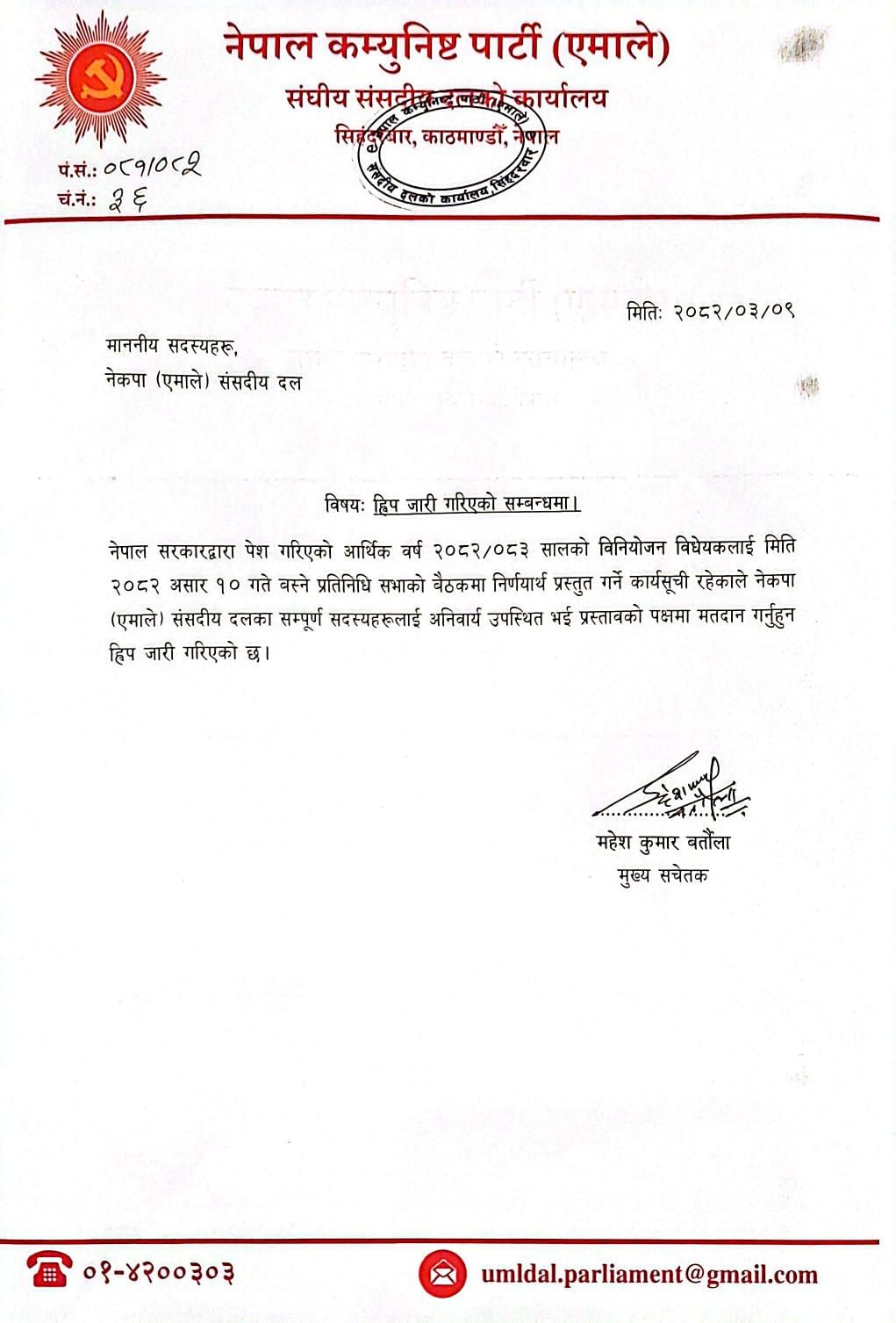 सरकारको नेतृत्व गरेको एमाले संसदीय दलको तर्फबाट मुख्यसचेतक महेश बर्तौलाले बजेटमा मतदान गर्न ह्वीप लगाएका हुन् ।