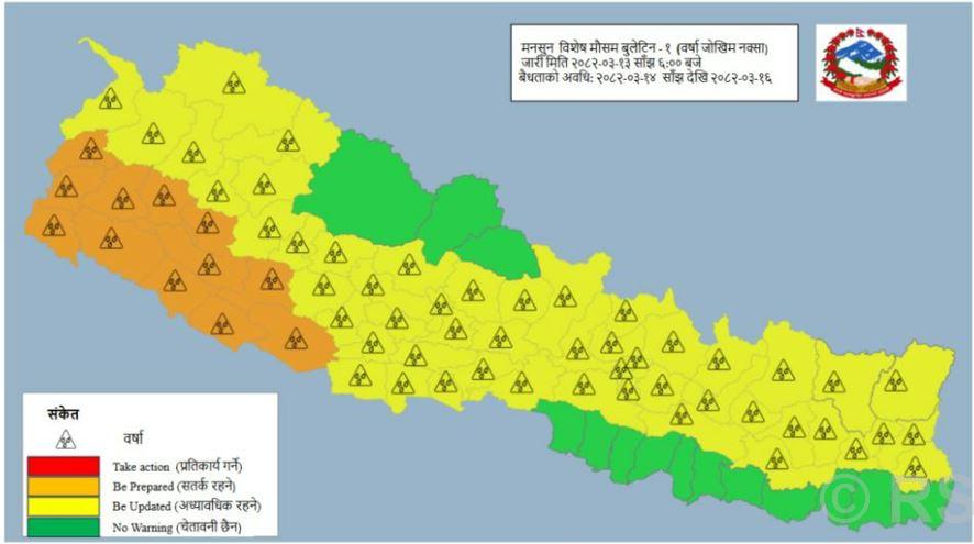 विभागले भनेको छ, “असार १४ गते शनिबार साँझदेखि २०८२ असार १६ सोमबार बिहानसम्म कर्णाली प्रदेशको पहाडी भूभाग, सुदूरपश्चिम र लुम्बिनी प्रदेशका पहाडी र तराईका भूभागका थोरै स्थानमा भारीदेखि धेरै भारी वर्षाको सम्भावना रहेको छ । साथै अन्य प्रदेशको पहाडी भूभागका एकदुई स्थानमासमेत भारीदेखि धेरै अतिभारी वर्षाको सम्भावना रहेको छ ।”