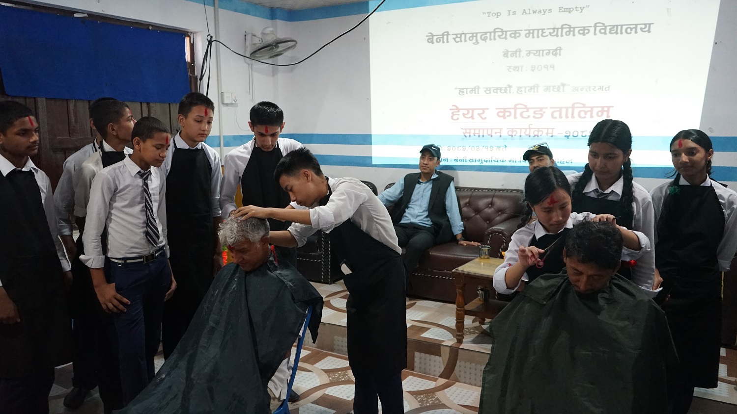 बेनी सामुदायिक विद्यालयले सञ्चालन गरेको कपाल काट्ने तालिममा सहभागी कक्षा ११ का सुयोग रेग्मीले घरपरिवारका सदस्यको कपाल काटेपनि खर्च बचत हुने र भविष्यमा व्यवसाय सञ्चालनका लागि सिकेको सिपले सहज हुने बताउँछन ।