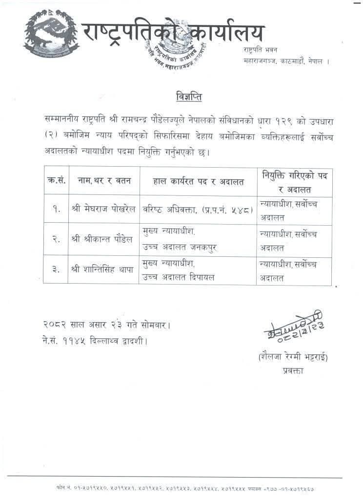 आज बसेको समितिको बैठकले सर्वोच्च अदालतको न्यायाधीशमा मेघराज पोखरेल, शान्तिसिंह थापा र श्रीकान्त पौडेल तथा न्याय परिषद् सदस्यमा प्रस्तावित महेशकुमार नेपालको नामलाई अनुमोदन गरेको थियो। उनीहरुलाई राष्ट्रपतिले आजै नियुक्त गरेका हुन् ।