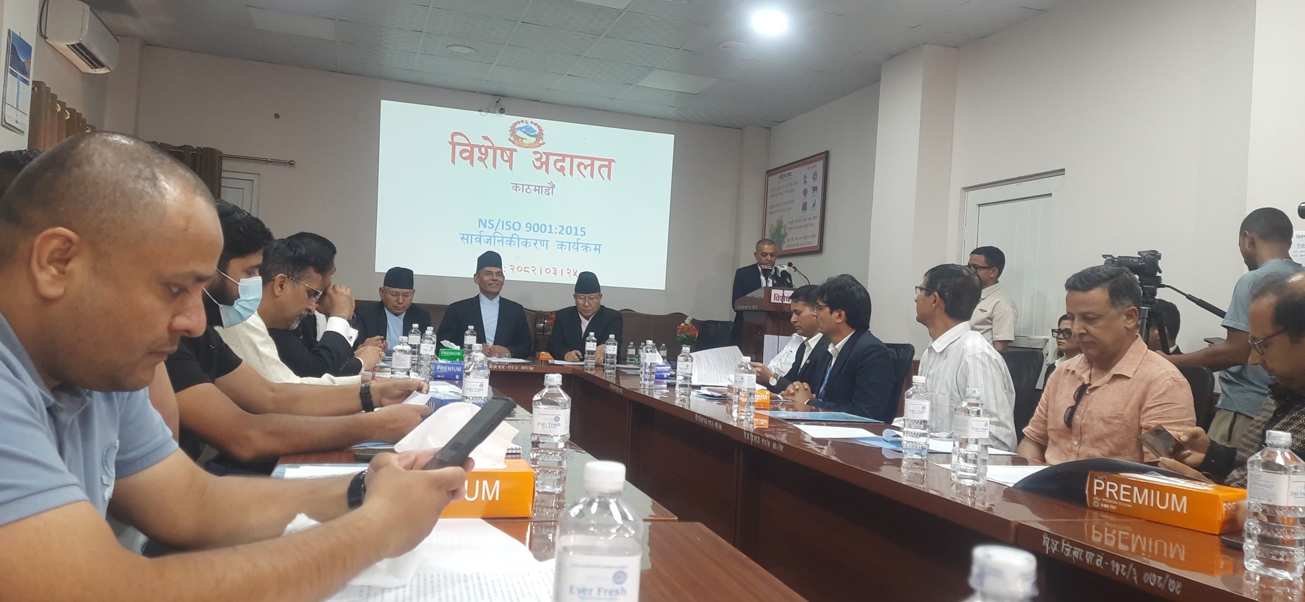 अदालतका अध्यक्ष टेकनारायण कुँवरले उक्त प्रमाणपत्र (यानएस/आइएसओ ९००१ः२०१५) को आज विशेष अदालतमा आयोजित कार्यक्रममा सार्वजनिक गरे । उनले न्यायिक तथा प्रशासनिक प्रक्रियामा उच्चतम इमान्दारीता, जवाफदेहिता र सार्वजनिक विश्वास कायम राख्न प्रयत्न गरिरहेकाले आइएसओको प्रमाणपत्र प्राप्त गर्न सफल भएको जानकारी दिए ।