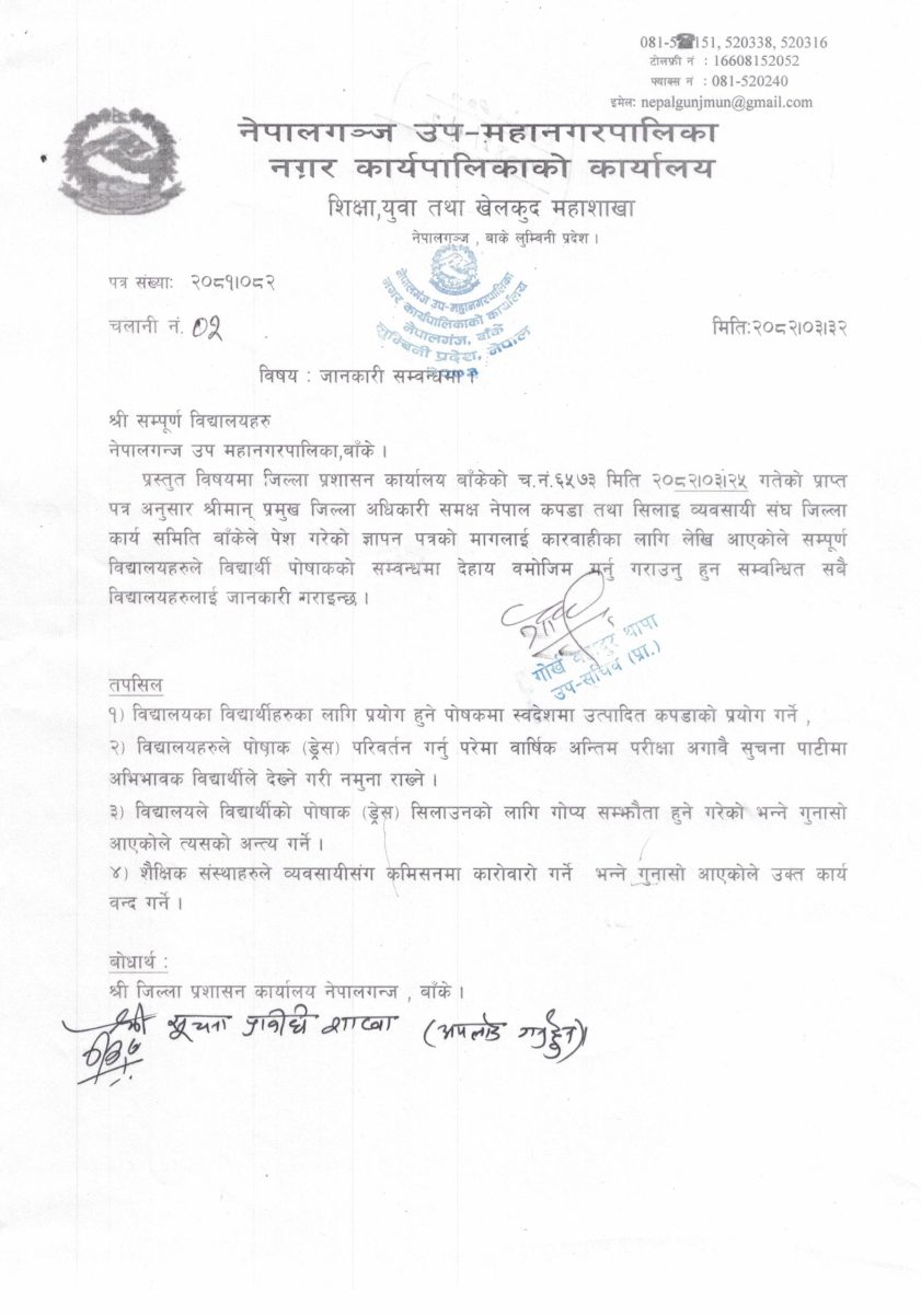 नेपालगन्जका विद्यालयहरुलाई नेपाली कपडा र नेपालकै टेलरमा सिलाएको पोशाक बनाउन उपमहानगरको निर्देशन