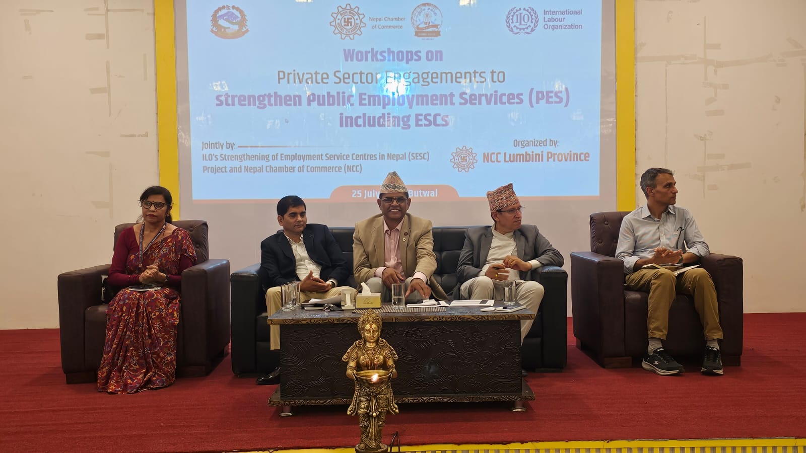 नेपाल चेम्बर अफ कमर्स लुम्बिनी प्रदेशको आयोजना तथा अन्तर्राष्ट्रिय श्रमिक संगठनको सहकार्यमा शुक्रबार बुटवलमा आयोजित सार्वजनिक रोजगार सेवालाई सुदृढ पार्न निजी क्षेत्रको सहभागिता सम्बन्धी कार्यशालामा नेपाली श्रमशक्ति र रोजगारीका अवसर बारे छलफल भएको हो ।