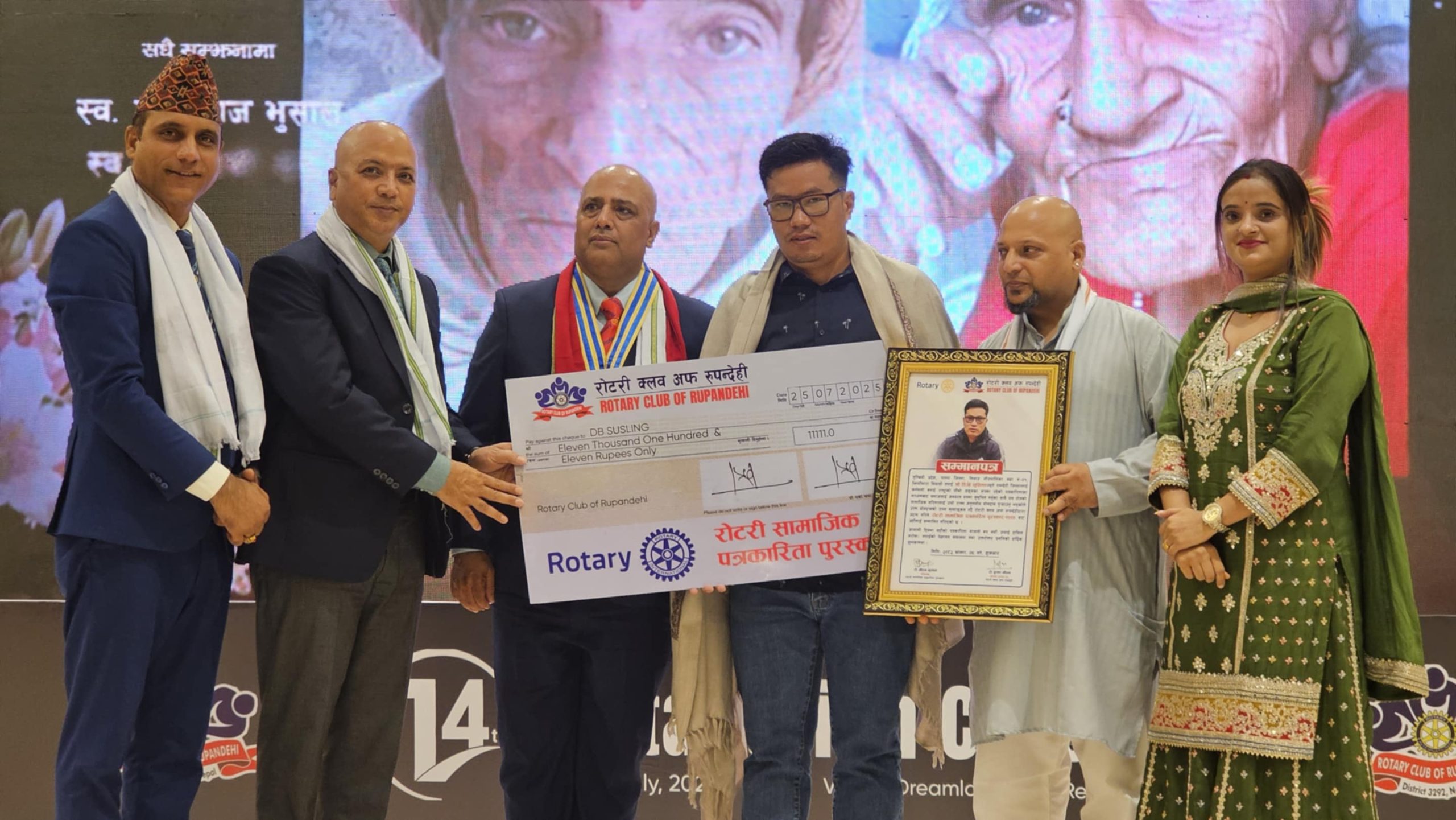 पदस्थापन समारोहमा पत्रकार डि.बी. सुस्लिङलाई क्लबले प्रदान गर्दै आएको रोटरी सामाजिक पत्रकारिता पुरस्कार-२०८२ प्रदान गरिएको थियो । क्लबका पूर्व अध्यक्ष गौतम भुसालले आफ्ना स्व. हजुरबुबा केशवराज भुसाल र हजुरआमा हिमादेवीको स्मृतिमा क्लबले प्रदान गर्ने गरी स्थापना गरेको पुरस्कार हरेक वर्ष प्रदान गरिँदै आएको छ । उक्त पुरस्कार यस अघि क्लबले पत्रकार भगवती पाण्डेयलाई प्रदान गरिएको थियो ।