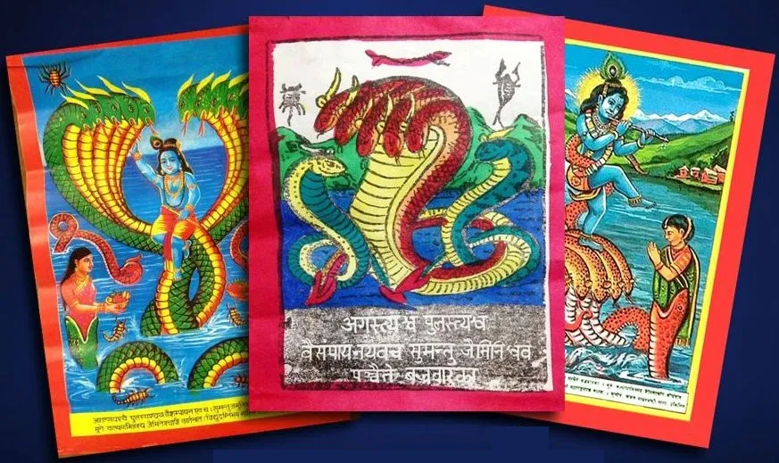 प्रसन्न भएकी नागिनीले तथास्तु भनी किसानका सपरिवारलाई बचाइदिइन् । यसरी नागिनीले किसान परिवारलाई बचाइदिएको दिन श्रावण शुक्ल पञ्चमी अर्थात् आजैको दिन भएकाले त्यही समयदेखि नागपूजा गरी घरमा टाँस्ने परम्परा बसेको जनविश्वास रहिआएको धर्मशास्त्रविद् प्रा डा भट्टराईले जानकारी दिए ।