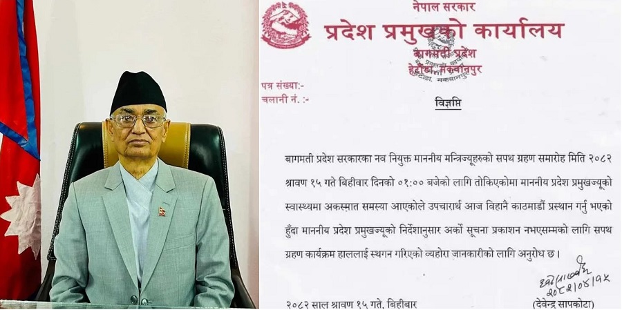 कार्यालयका प्रवक्ता देवेन्द्र सापकोटाले विज्ञप्ति जारी गर्दै शपथ स्थगित गरिएको जानकारी दिएका छन् । विज्ञप्तिमा उल्लेख छ, “बागमती प्रदेश सरकारका नवनियुक्त माननीय मन्त्रीहरूको सपथ ग्रहण समारोह मिति २०८२ साल श्रावण १५ गते विहीबार दिनको १ बजेका लागि तय गरिएकोमा माननीय प्रदेश प्रमुखज्यूको स्वास्थ्यमा अकस्मात् समस्या उत्पन्न भएकाले उहाँ आज बिहानै काठमाडौं प्रस्थान गर्नु भएको छ। उहाँको निर्देशनअनुसार अर्को सूचना जारी नभएसम्मका लागि शपथग्रहण कार्यक्रम हाललाई स्थगित गरिएको व्यहोरा जानकारीका लागि अनुरोध छ।”