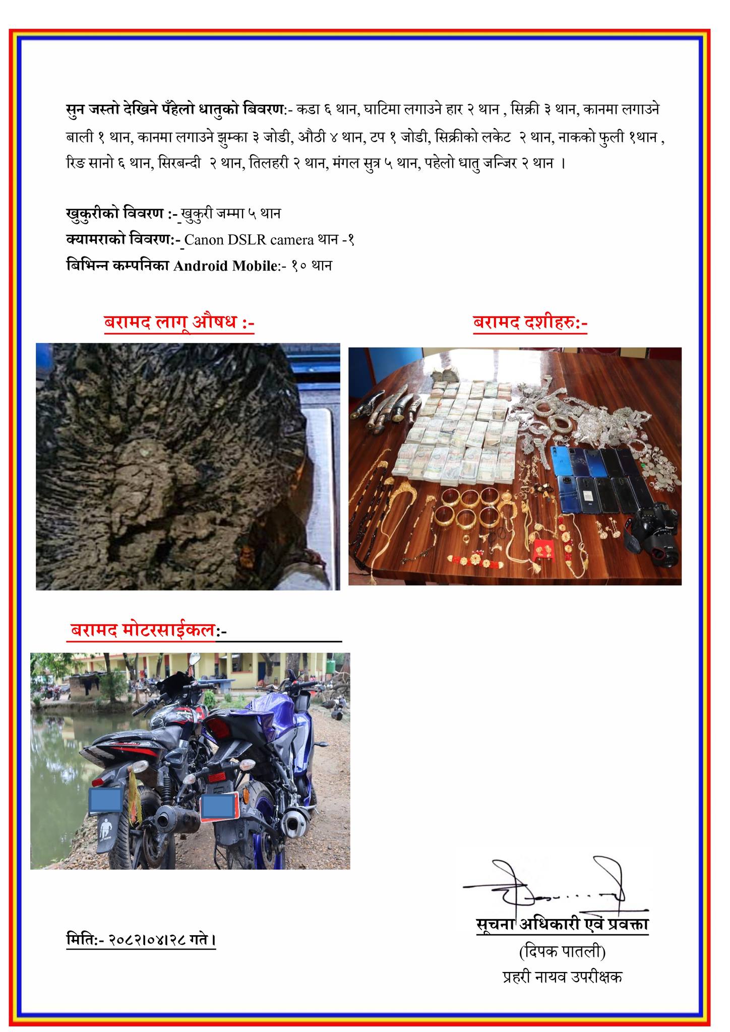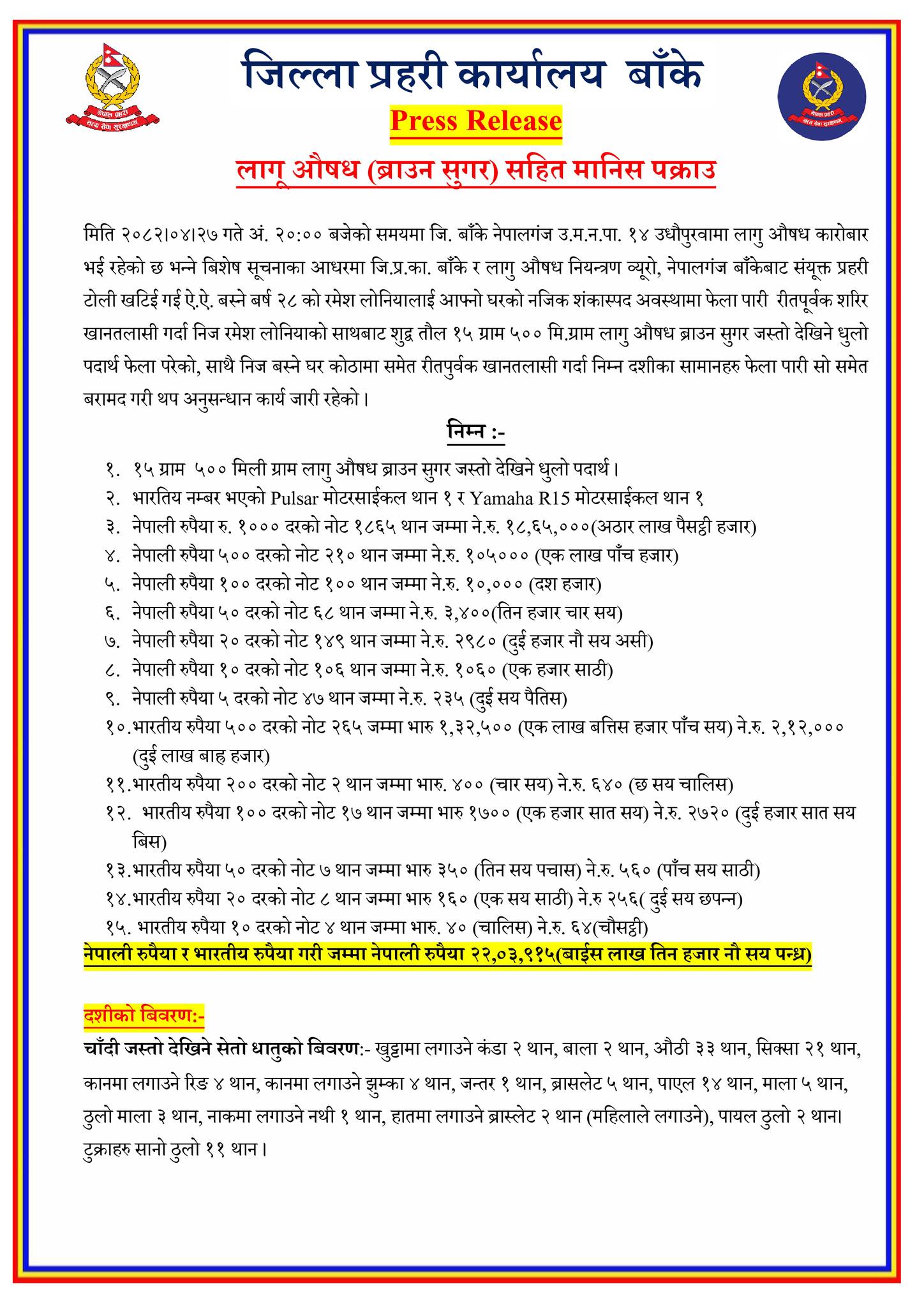विशेष सूचनाका आधारमा मंगलबार राति नेपालगन्ज-१४ उदयपुरका २८ वर्षीय रमेश लोनियालाई नियज्त्रणमा लिई उनको साथबाट १५ ग्राम ५ सय मिलिग्राम ब्राउन सुगर बरामद गरेको तथा उनको घर खानतलासी गर्ने क्रममा नेपाली र भारतीय गरी २२ लाख ३ हजार ९१५ रुपैयाँ सहित गरगहना, घरेलु हतियार बरामद भएको बाँके प्रहरी प्रवक्ता डीएसपी दीपक पातलीले जानकारी दिए ।