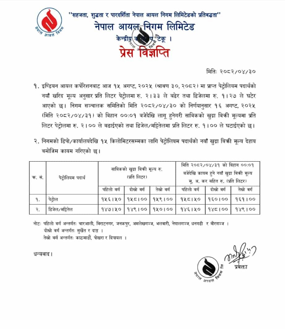 आज निगमले जारी गरेको विज्ञप्ति अनुसार डिजेल र मट्टितेलको मूल्य भने घटेको छ । नेपाल आयल निगमले पेट्रोलको मूल्य बढाएको छ भने डिजेलरमट्टितेलको मूल्य घटाएको हो ।