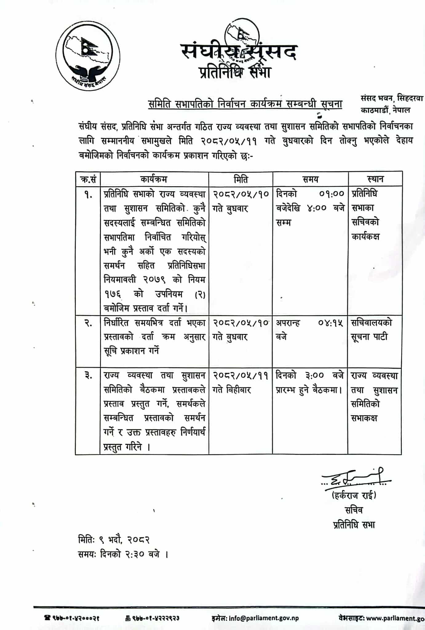 काठमाडौं । प्रतिनिधिसभा अन्तर्गतको राज्य व्यवस्था तथा सुशासन समितिको सभापति चयनका लागि भदौ ११ गते बुधबार निर्वाचन हुनेभएको छ । संसद सचिवालयले आज निर्वाचन तालिका प्रकाशित गर्दै बुधबार मतदानको तालिका सार्वजनिक गरेको हो ।