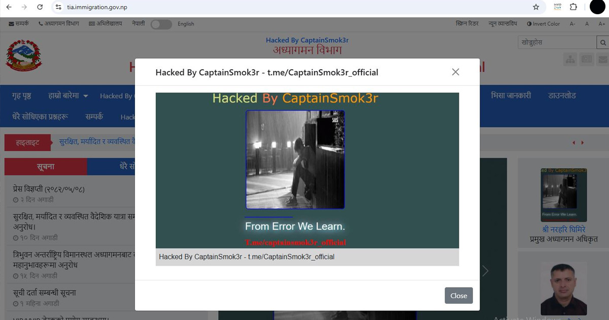 काठमाडौं । त्रिभुवन अन्तर्राष्ट्रिय विमानस्थलस्थित अध्यागमन कार्यालयको वेबसाइट ह्याक भएको छ । आफूलाई ‘क्याप्टेन स्मोक थ्री आर’ परिचय दिने ह्याकरले वेबसाइट नियन्त्रणमा लिएर सुरक्षात्मक कमजोरी देखाउने सूचना सार्वजनिक गरेका छन् ।