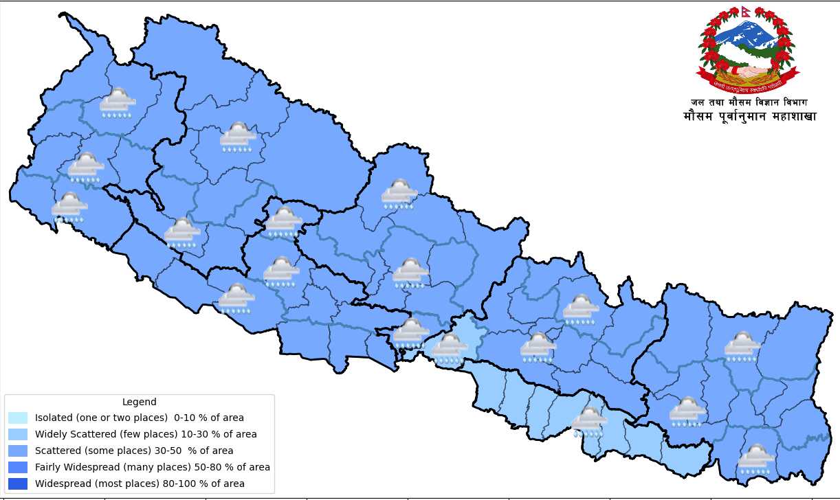 त्यसैगरी, आज राति देशभर आंशिकदेखि साधारणतया बदली हुनेछ । कोशी र सुदूरपश्चिम प्रदेशका एकदुई स्थानमा भारी वर्षाको सम्भावना छ ।