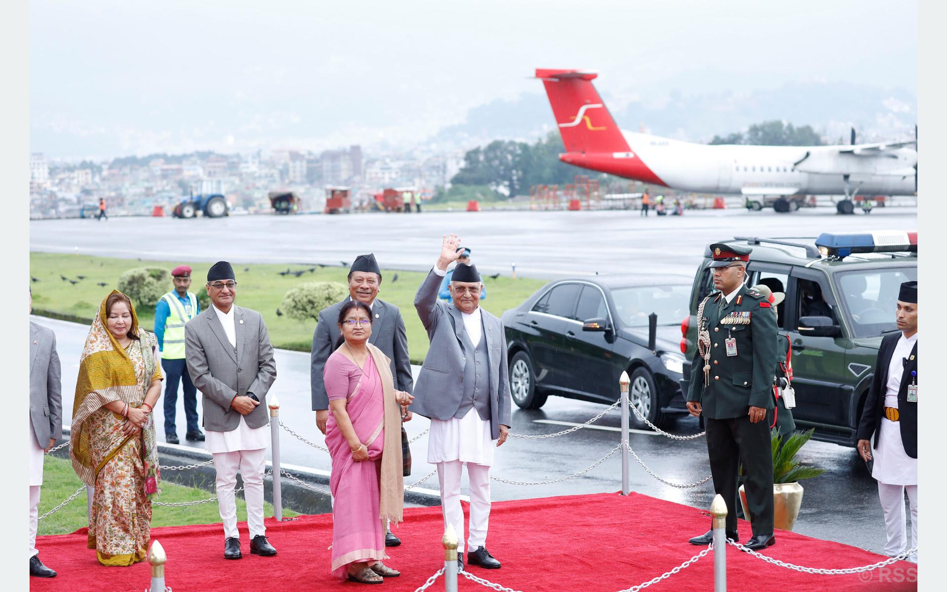 त्रिभुवन अन्तरराष्ट्रिय विमानस्थलको अतिविशिष्ट कक्षमा प्रधानमन्त्री ओलीलाई उपप्रधानमन्त्री एवं सहरी विकासमन्त्री प्रकाशमान सिंह, गृहमन्त्री रमेश लेखक, परराष्ट्रमन्त्री डा आरजु राणा देउवा तथा मुख्यसचिव एकनारायण अर्यालले बिदाइ गरे ।