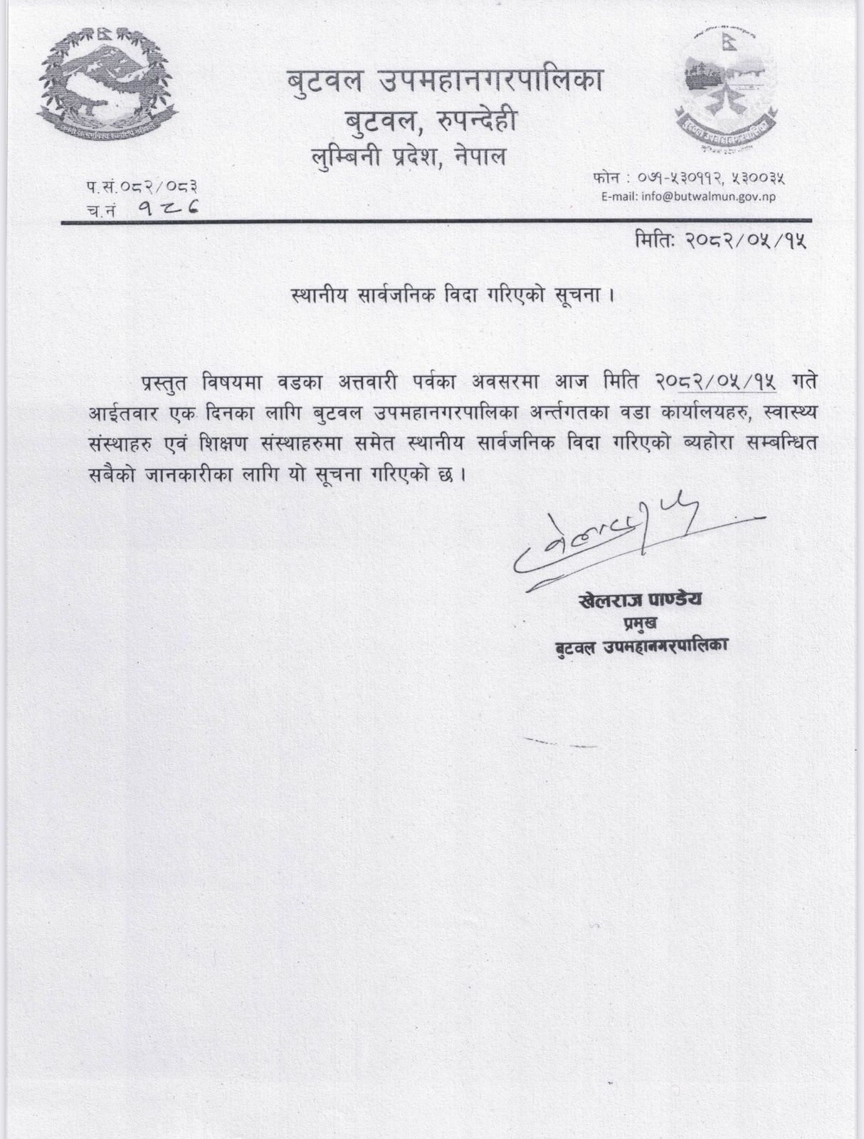 बुटवल । बुटवल उपमहानगरपालिकाले आज एक दिन स्थानीय सार्वजनिक बिदा दिएको छ । उपमहानगरपालिकाले बड्का अत्तवारी पर्वको अवसरमा आज सार्वजनिक बिदा दिएको हो ।