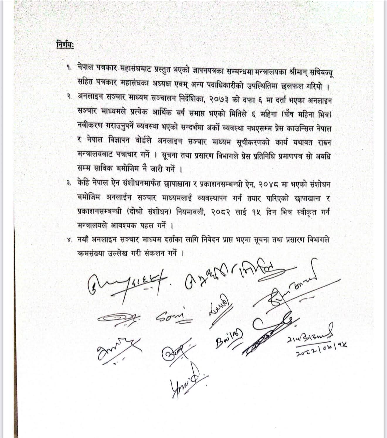 साथै, अनलाइन सञ्चारमाध्यम सञ्चालन निर्देशिका २०७३ को दफा ६ मा दर्ता भएका अनलाइन सञ्चार माध्यमले प्रत्येक आर्थिक वर्ष समाप्त भएको मितिले ६ महिना (पौष महिना भित्र) नवीकरण गराउनु पर्ने व्यवस्था भएको सन्दर्भमा अर्को व्यवस्था नभएसम्म प्रेस काउन्सिल नेपाल र नेपाल विज्ञापन बोर्डले अनलाइन सञ्चारमाध्यम सूचीकरणको कार्य यथावत् राख्न मन्त्रालयबाट पत्राचार गर्नेलगायत ४ बुँदे सहमति भएको हो ।